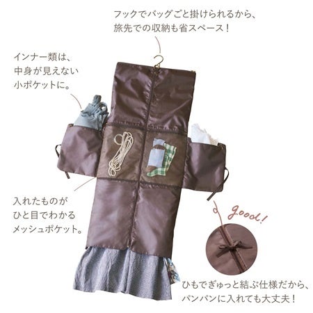 スーツなどを収納するガーメントバッグから着想を得たトラベルバッグです。ハンガーに掛けたまま入れるだけで、パッキングが完了します。コンパクトなのに、ハンガーおよそ4本分の洋服を収納できて、アクセサリーやインナーなどの小物類を入れることができる便利なファスナーポケットも付いています。旅先でもバッグごと掛けられるので、そのままマイワードローブが完成します。