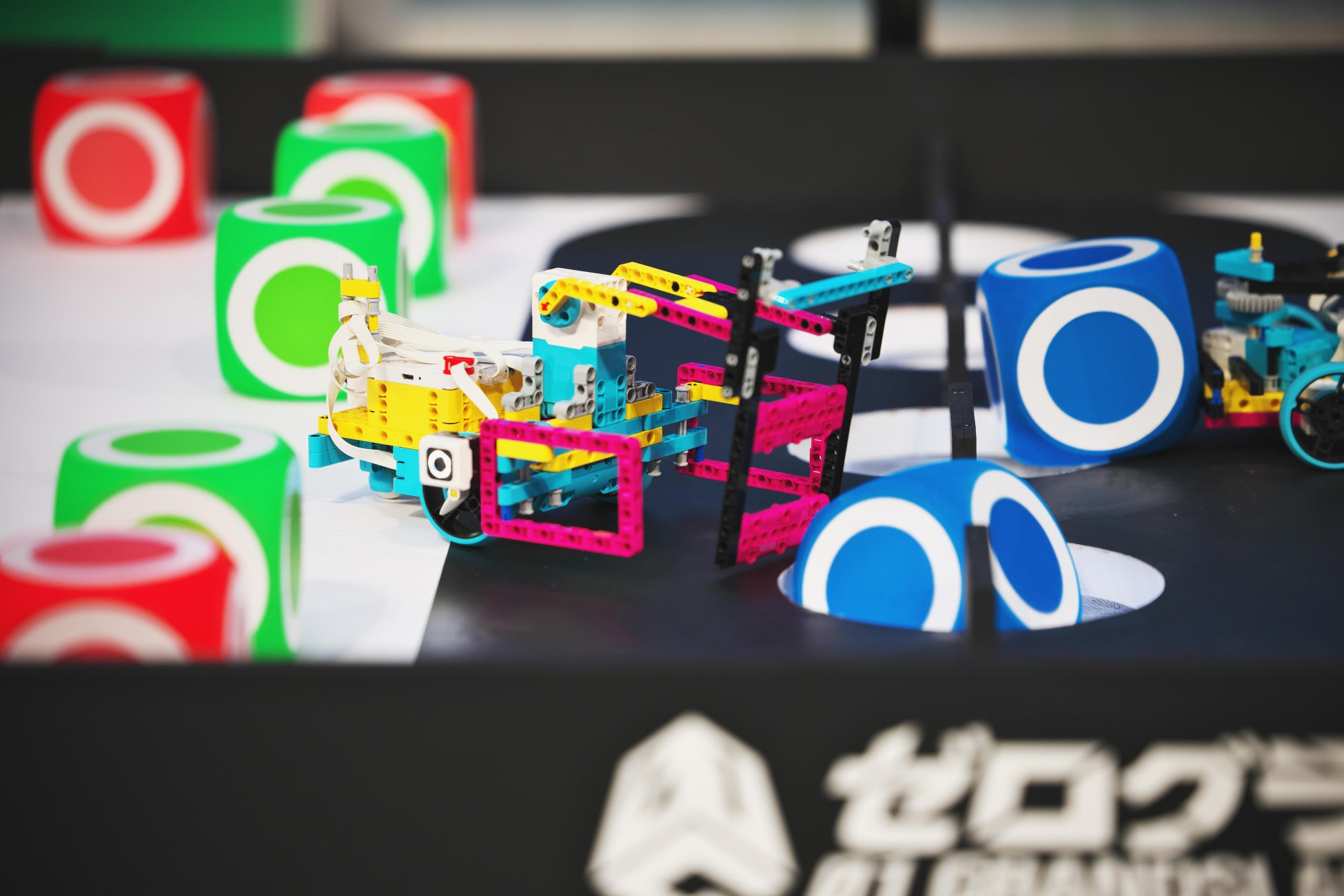 対戦する2チームが同一のフィールド上で戦うため、相手チームとの戦略上の駆け引きも発生。今年は、どちらのチームポイントにもならない、いわば「おじゃまブロック」として緑色のブロックも登場しました。どんなロボットを組み、どんなプログラムで動かすかが、勝敗を分ける大きなカギとなりました。