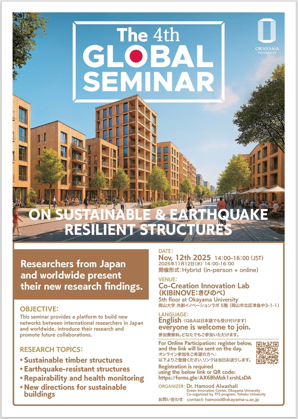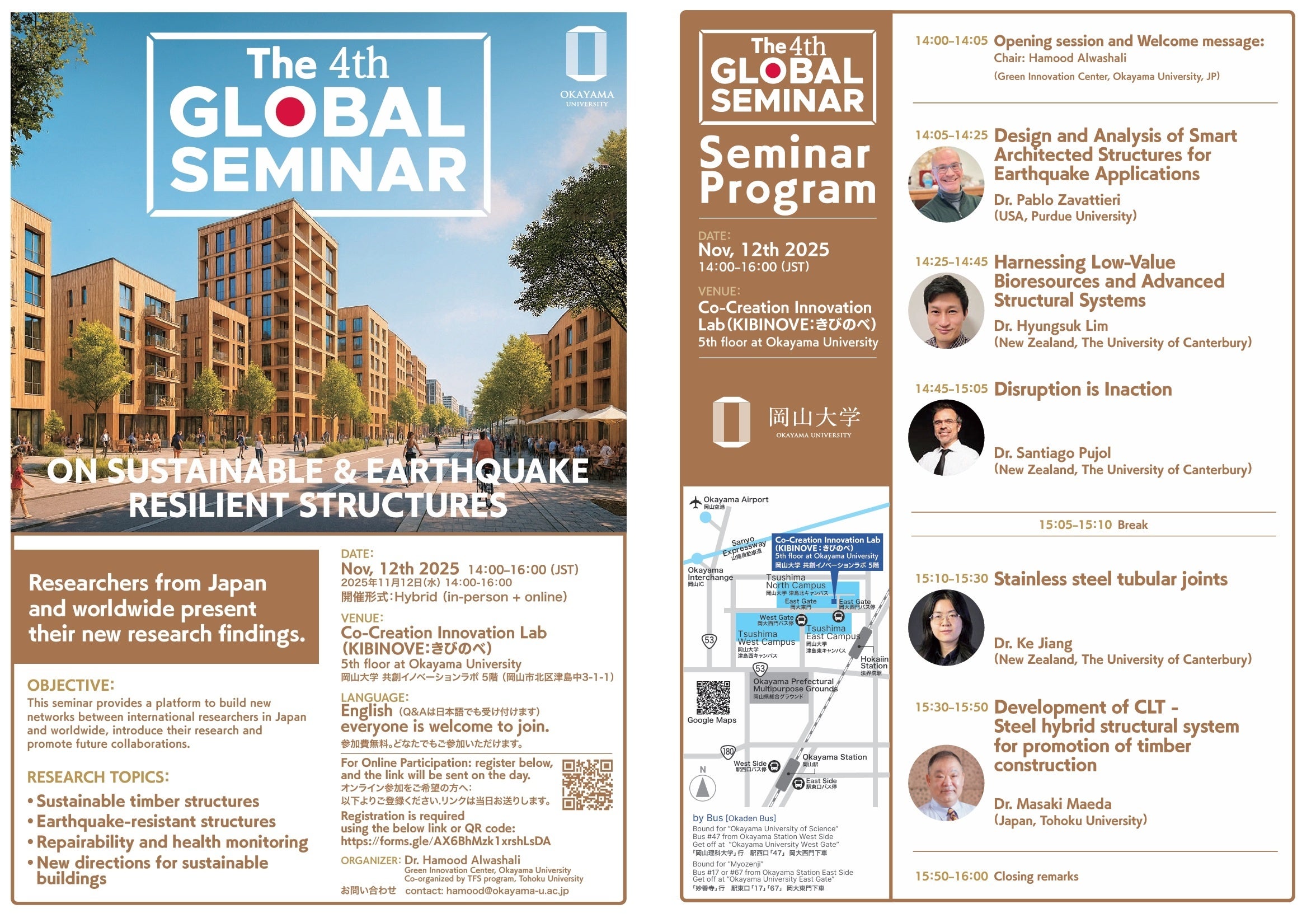 国立大学法人岡山大学(本部:岡山市北区、学長:那須保友)のグリーンイノベーションセンターでは、2025年11月12日(水)14:00〜16:00に、本学津島キャンパスの共創イノベーションラボ(KIBINOVE:きびのべ)においてアメリカ、ニュージーランド、日本より5名の構造設計研究者が来日し、講演を行う「The 4th GLOBAL SEMINAR ON SUSTAINABLE & EARTHQUAKE RESILIENT STRUCTURES」を開催します。