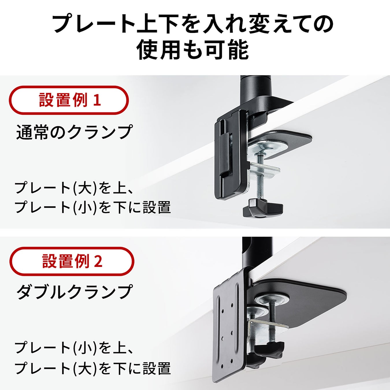 本製品は、クランプ式のモニタアームをデスクに取付ける際に、取付け部のゆがみやたわみを軽減するための補強プレートです。
