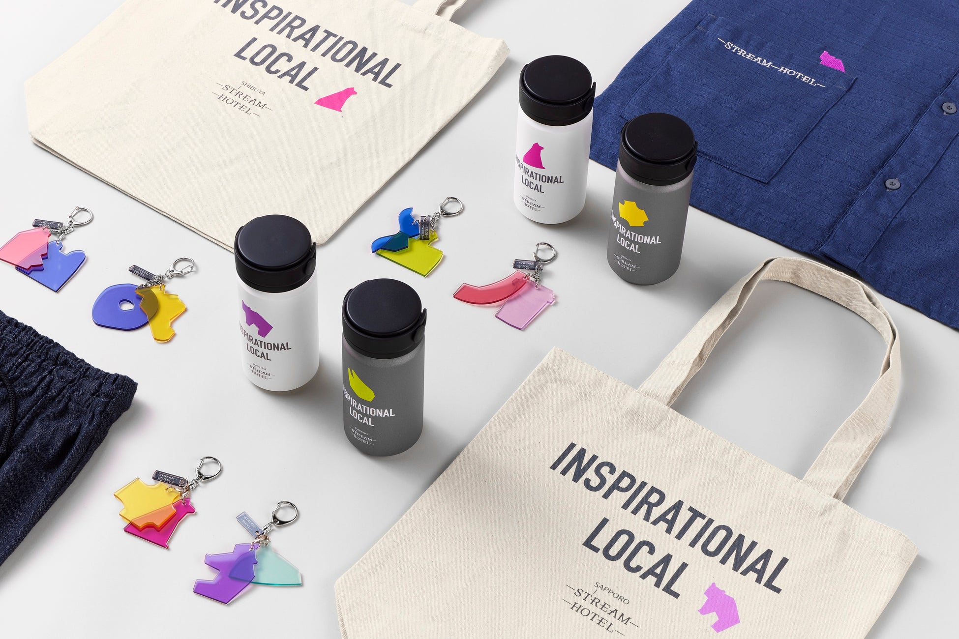 「STREAM HOTEL」を象徴するユニークなデザインは、日本伝統の紋様「流水紋」をモチーフとした、流れる(=ストリーム)ラインをベースとし、その上にホテルが立地するエリアの有名なスポットや特産品を抽象的にかたどったカラフルなモチーフを重ねて構成。ホテルグッズやアイテムとして旅の思い出づくりを彩りながら、お客さまとホテルスタッフとの会話のきっかけにもなっています。またアメニティにはウィットの効いた様々なコピーをデザインし、思いがけず近隣のスポットやお店と出会えるような仕掛けをつくるなど、ホテル・お客さま・地域の接点を創出しています。