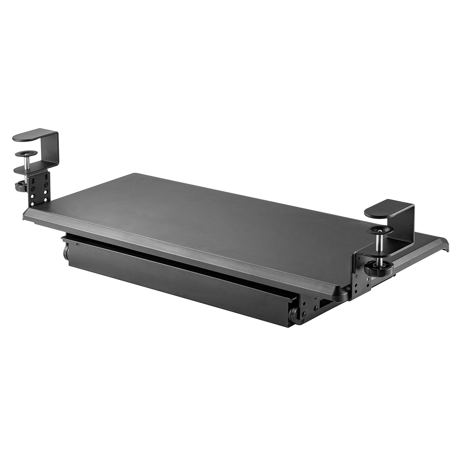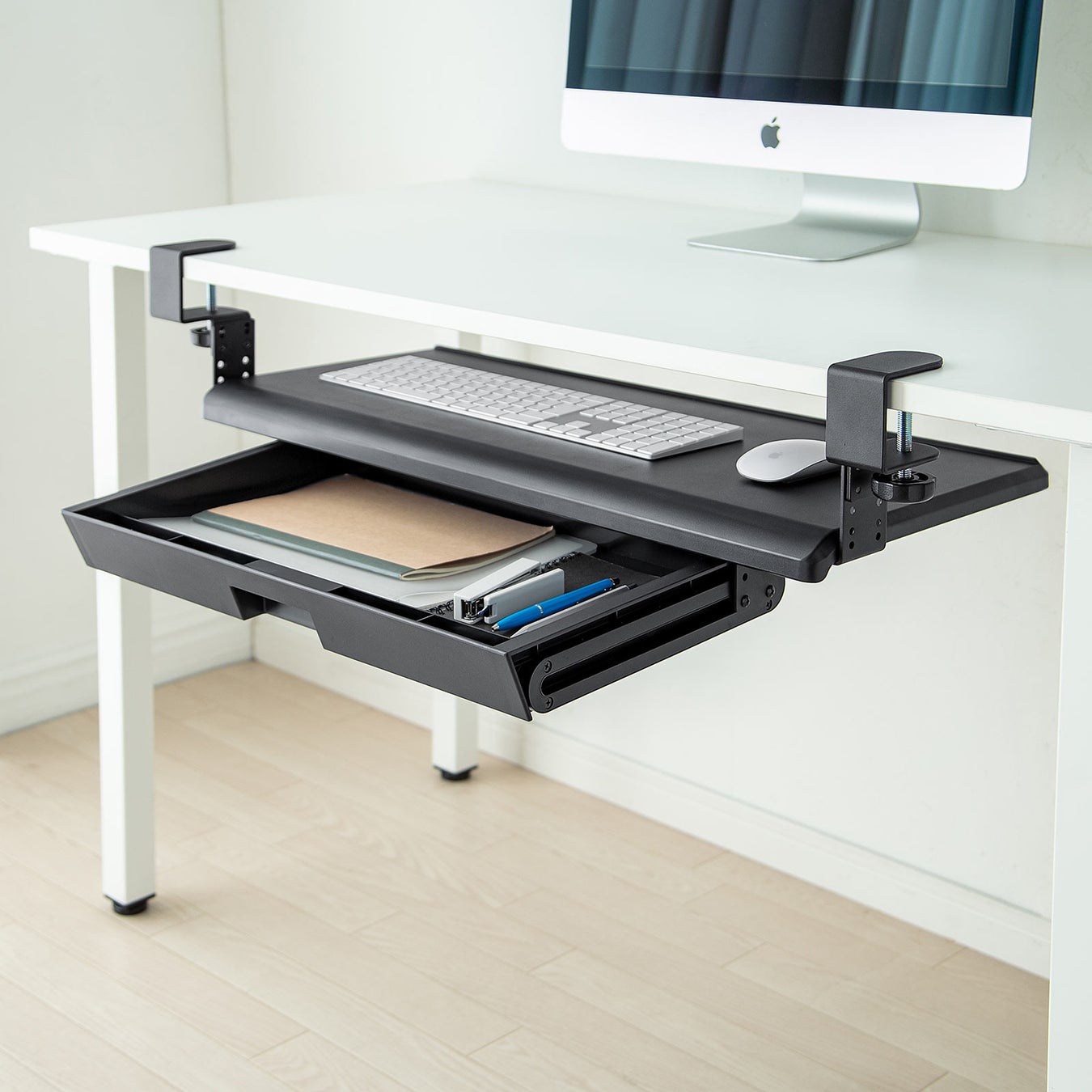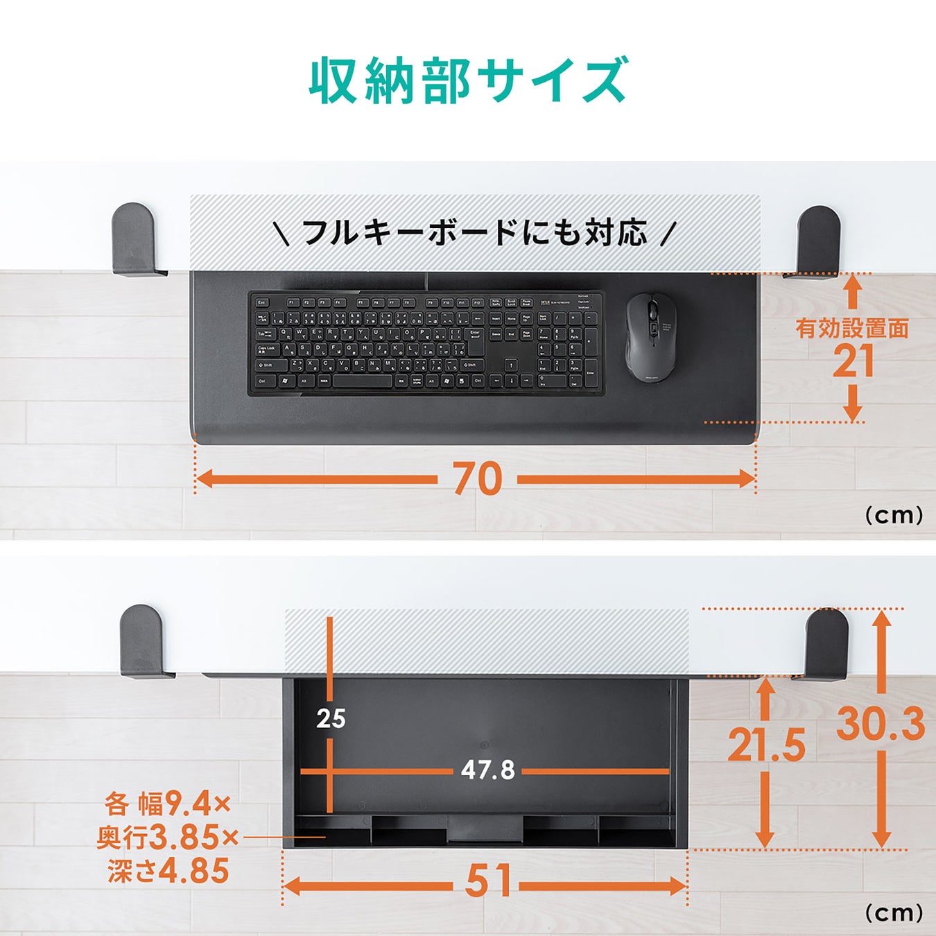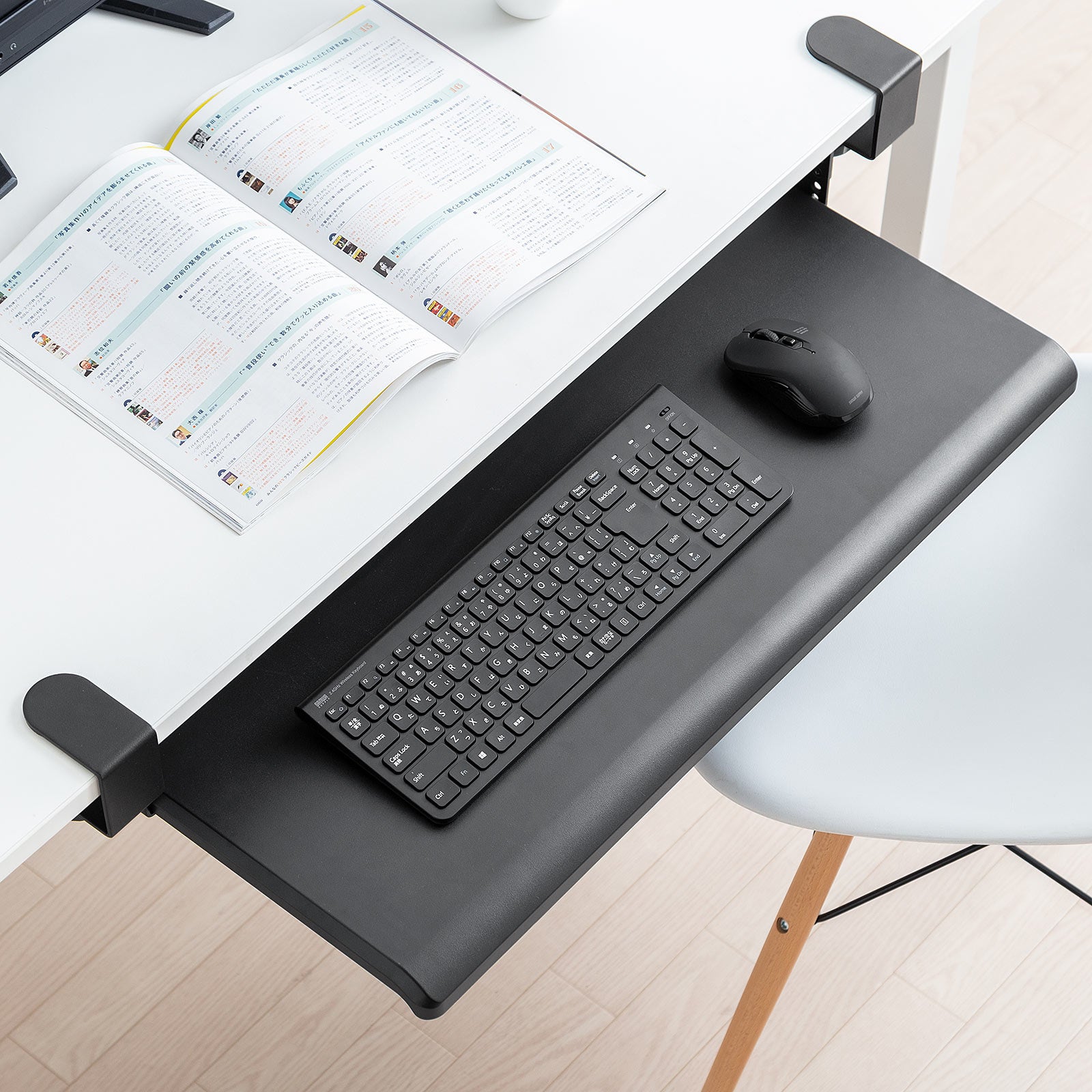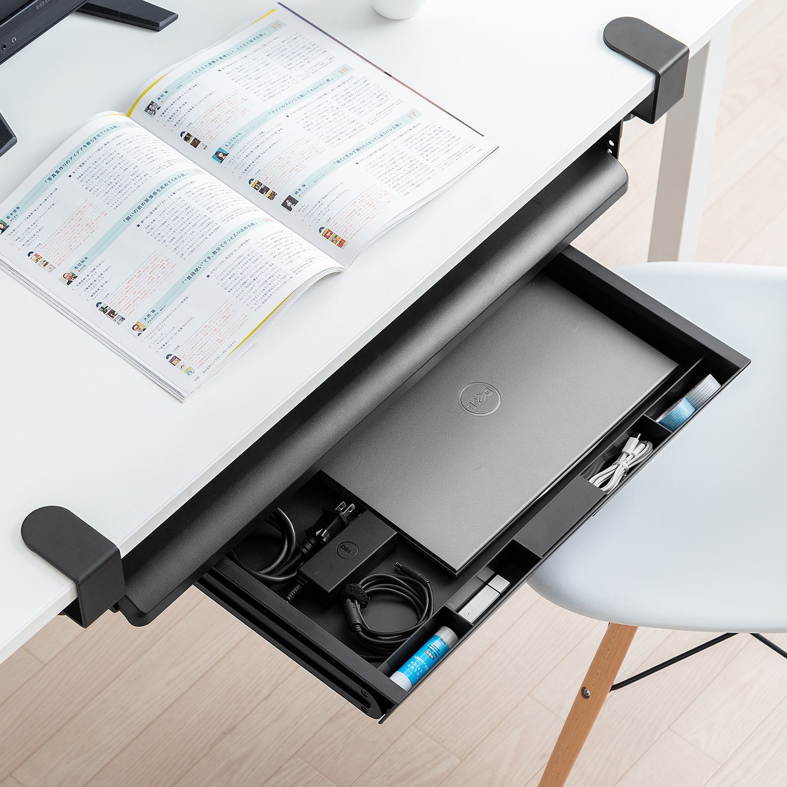 本製品は、デスクにキーボードの置き場所と書類や文房具の収納スペースを追加できる、引き出し付きキーボードスライダーです。