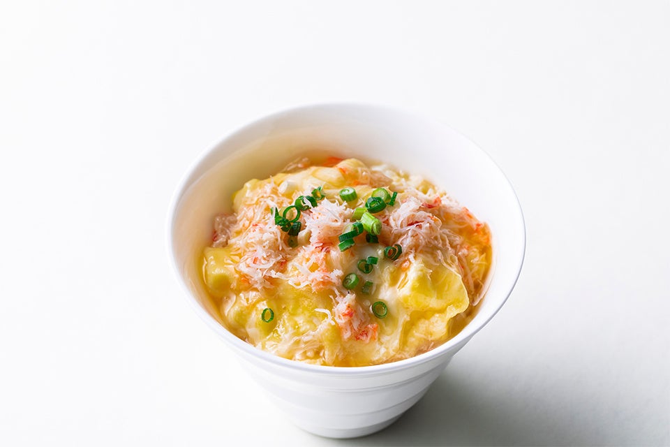 自然豊かな道北、下川町のブランド卵とボイルずわいがにのほぐし身を使用した贅沢なかに玉。熱々のごはんに、ふんわりとろけるかに玉は口の中に幸せを運びます。