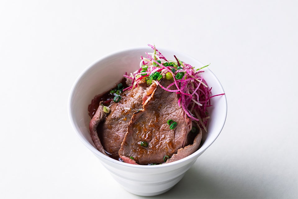 和牛の薄切り肉をさっと焼き、特製のタレ(醤油ベースのおろし玉葱ソース)につけていただく、シンプルながらも奥深い美味しさの丼です。