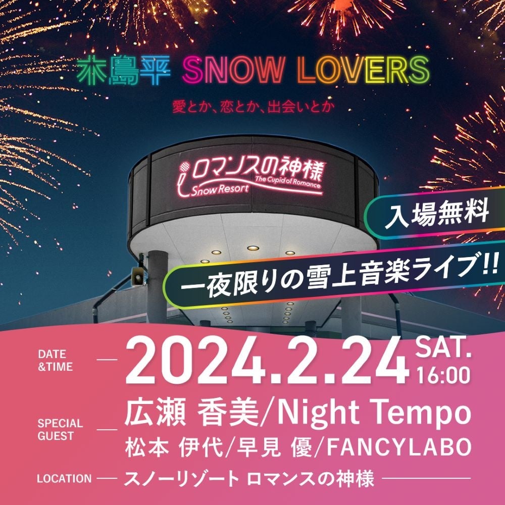 Night Tempoは2/15にZepp Shinjukuで自身の来日バースデイ・ライヴを行うが、更に長野県の木島平村にあるスキー場「スノーリゾート ロマンスの神様」で2/24に開催される雪上音楽ライヴ「木島平 SNOW LOVERS~愛とか、恋とか、出会いとか」への出演も決定した。出演はこれまでコラボをしている広瀬香美、松本伊代、早見優、そして彼がプロデュースするレトロポップ・ユニット、FANCYLABO。2/15のライヴとは趣きの異なる
