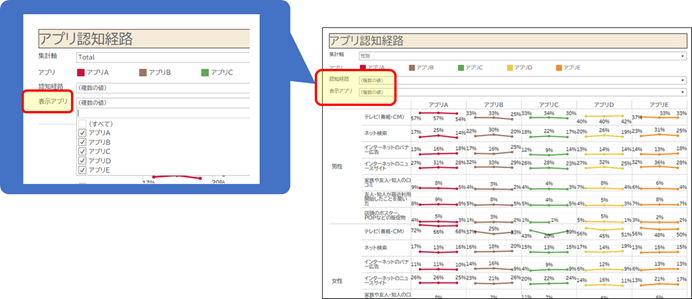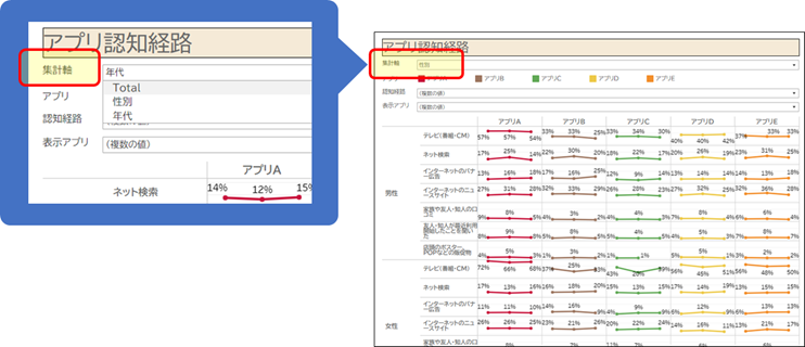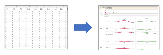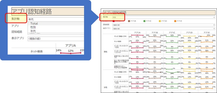 このサービスにより、リサーチしたデータを数表ではなくグラフなどビジュアルで見せることができるようになり、直感的に理解しやすくなります。また、切り口の変化に加え、焦点を絞った可変可能なグラフとして提供することができ、スピーディーに確認・分析することが可能になります。