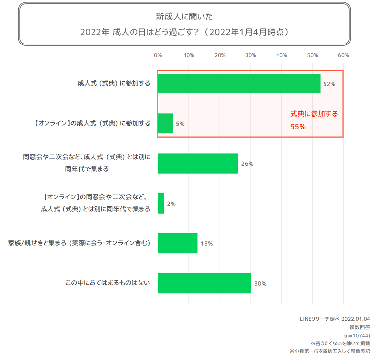 2022年の成人式の参加予定率は55%(実際に集まる形式・オンライン形式いずれかの参加予定率)。昨年2021年の調査結果( https://research-platform.line.me/archives/36894063.html#1 )では39%だったため10ポイント以上増加しました。