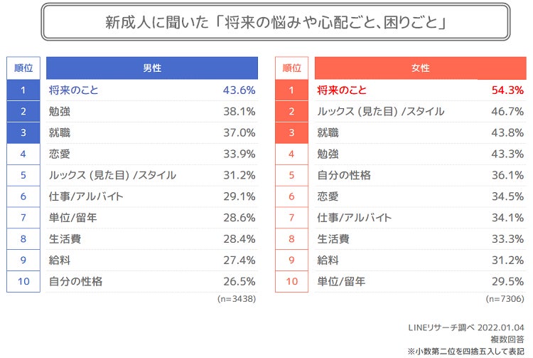 2位以降は男女でやや傾向が異なりますが、「勉強」「就職」「恋愛」といった項目は共通で上位となっており、新成人の年代にとっての心配事と言えそうです。