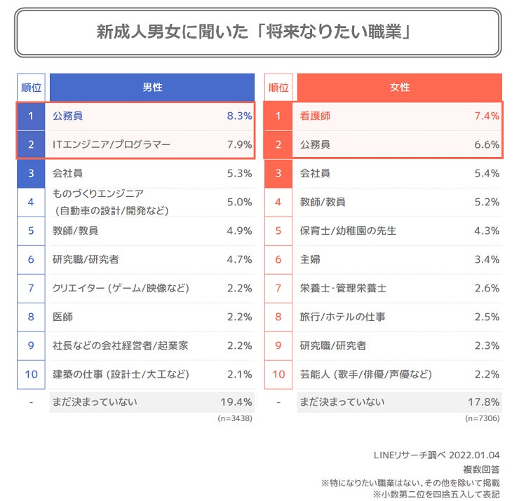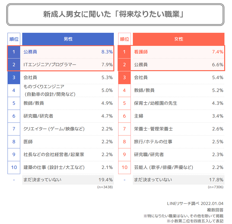 【LINEリサーチ】2022年の成人式の参加予定率は55%、昨年よりも10ポイント以上増加する結果に 新成人のなりたい職業は、男性は「公務員」、女性は「看護師」が1位にランクイン