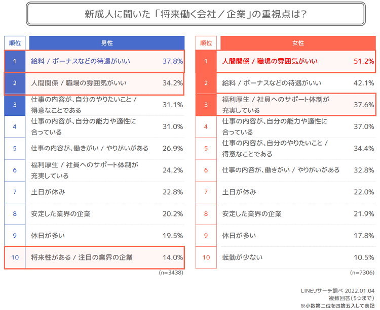 女性は「人間関係/職場の雰囲気がいい」が51%と高く、3位に「福利厚生/社員へのサポート体制が充実している」が4割弱となり、男性の6位に比べ上位となりました。