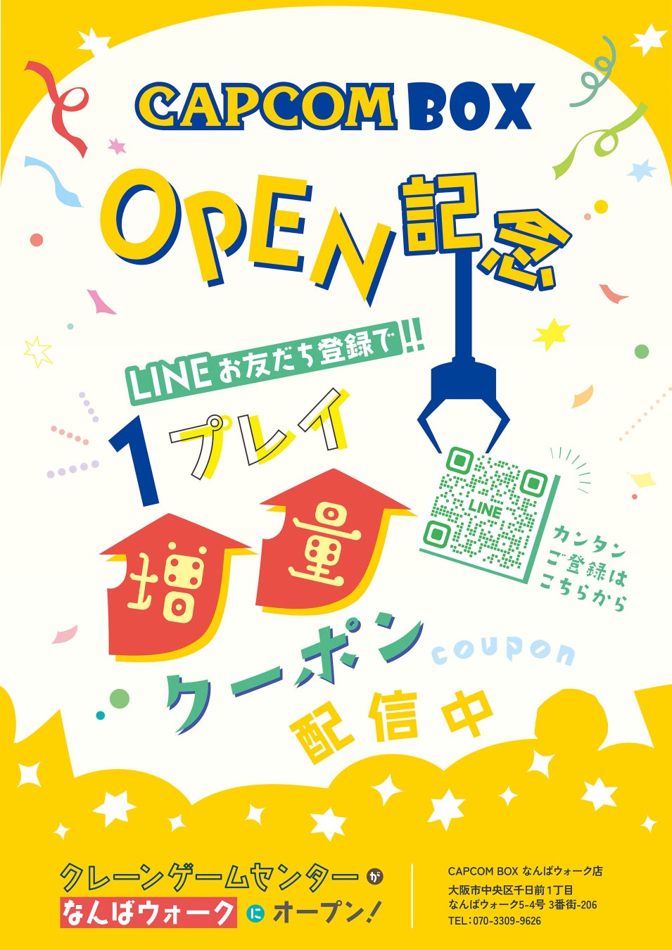 【内容】:「CAPCOM BOX なんばウォーク店」のLINEアカウントにお友達登録いただくと、クレーンゲームの1プレイ分の料金でもう1プレイ増量となるクーポンを差し上げます。