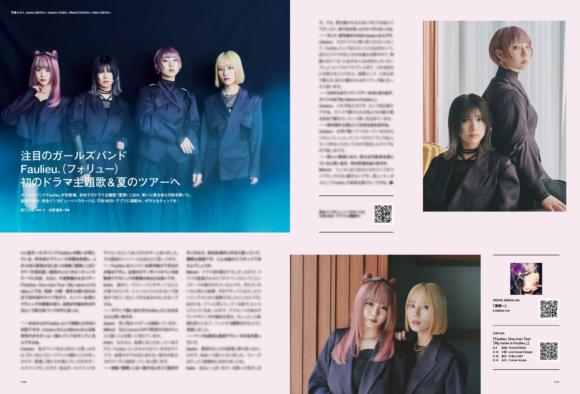 バックカバーで登場するUVERworldには、結成25周年&デビュー20周年のアニバーサリーイヤーに際しての6人のバンドインタビューと、ニューアルバム『EPIPHANY』(7.2発売)に向けてのTAKUYA∞ソロインタビューの2本立て取材を実施、「METROCK 2025」のライブレポートも掲載し、東京ドーム2DAYSに挑む彼らの熱量を伝えます。