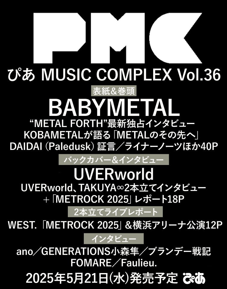 本日発売!『ぴあMUSIC COMPEX(PMC)Vol.36』表紙BABYMETAL世界最速インタビュー&KOBAMETAL。バックカバーUVERworld & TAKUYA∞ 2本立てインタビュー