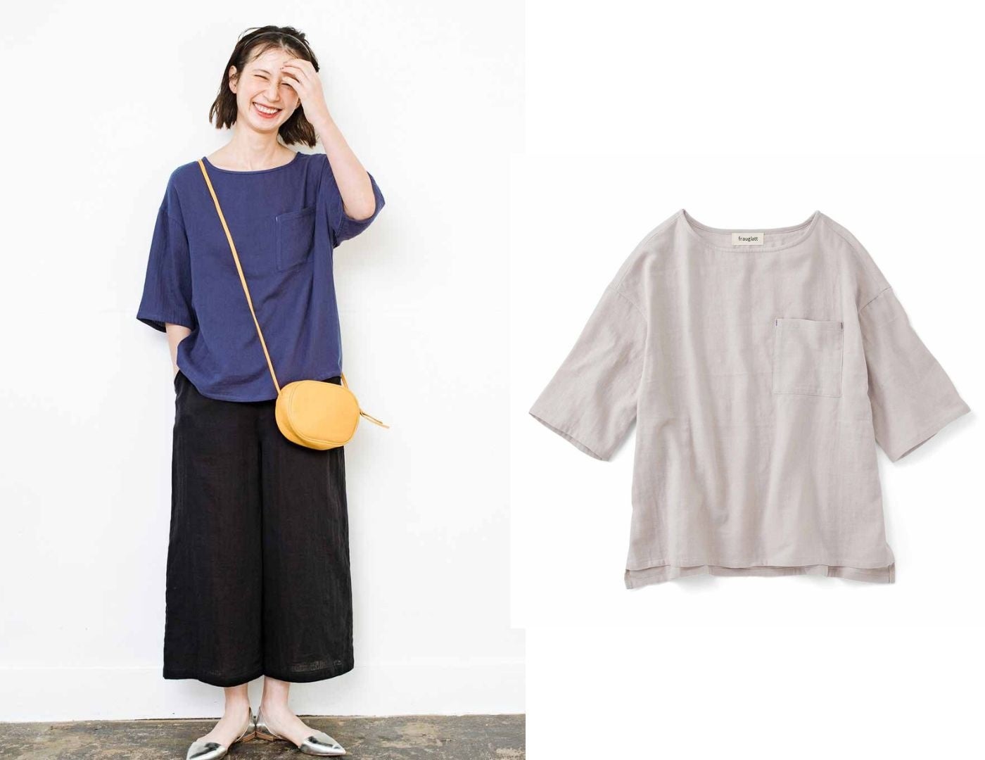 二の腕とひじをカバーする六分袖のトップスです。肘までふんわり隠れる長めの袖丈で体形カバーにも最適。洗うたびに柔らかくなじんでいくので、長く愛用したくなります。サイドはさりげない段差で、横から見てもすっきりしています。