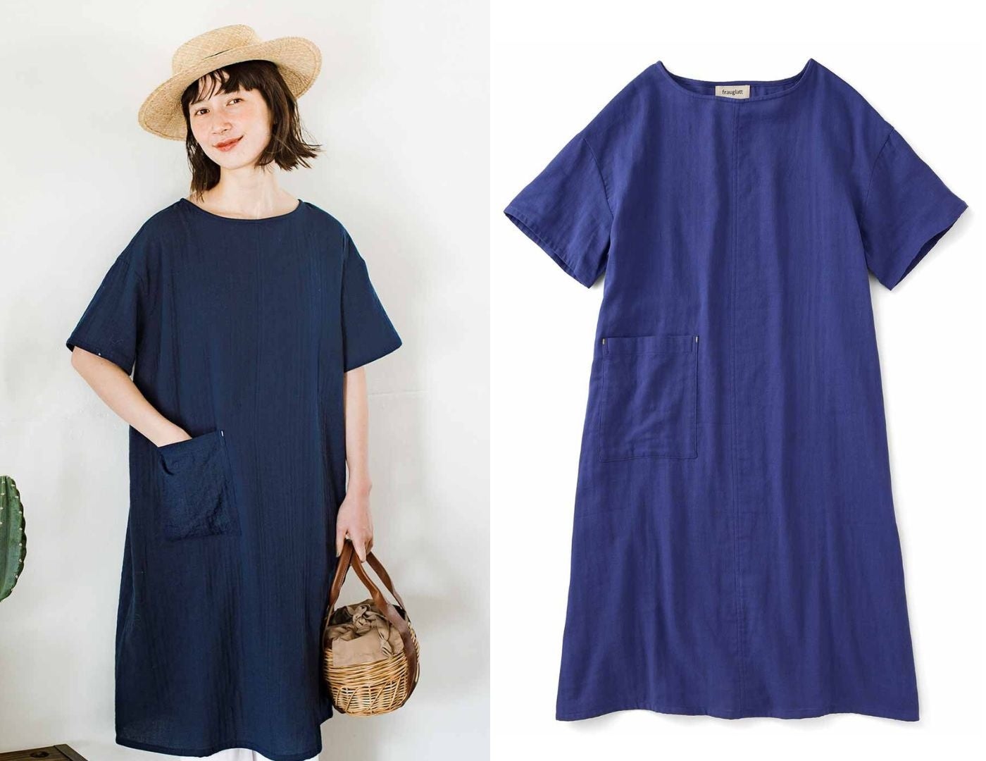 すぽっと着られてサマになるダブルガーゼワンピースに、新色のニュアンスブルーが登場。センターの切り替えが、からだをすっきりと見せ、片側にある大きめのポケットが腰まわりをカバーします。動きやすい丈感で、デニムやレギンスとの相性も抜群です。