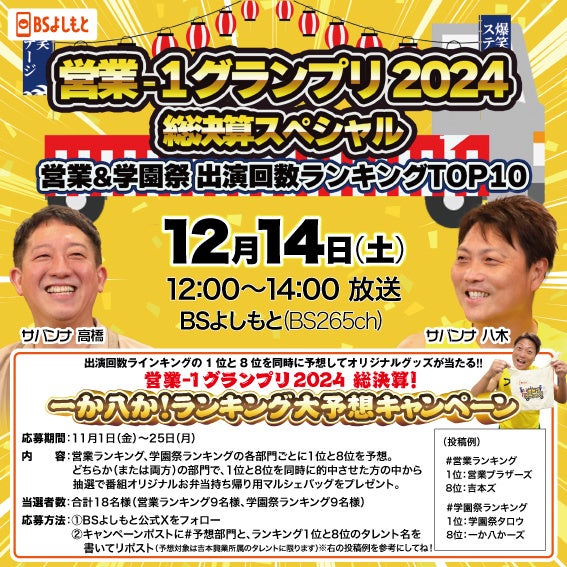 12月14日(土)12:00より放送の、BSよしもと特別番組「営業‐1グランプリ2024 総決算スペシャル~営業&学園祭 出演回数ランキングTOP10~」において、すでに発表されているサバンナに次ぎ、ちゃらんぽらん冨好とミサイルマン西代洋の出演が決まりました。