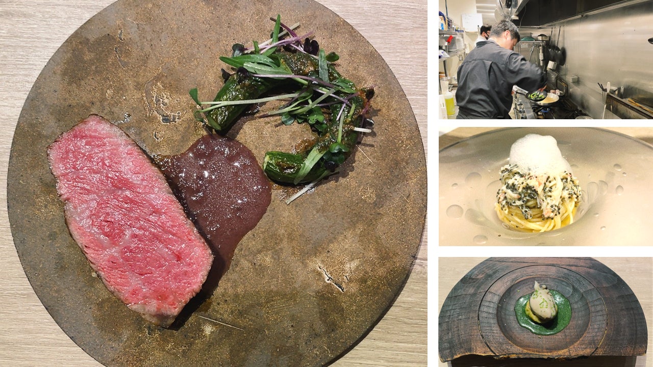 (左)和牛リブロース 藁焼き (右上)向井シェフの調理風景