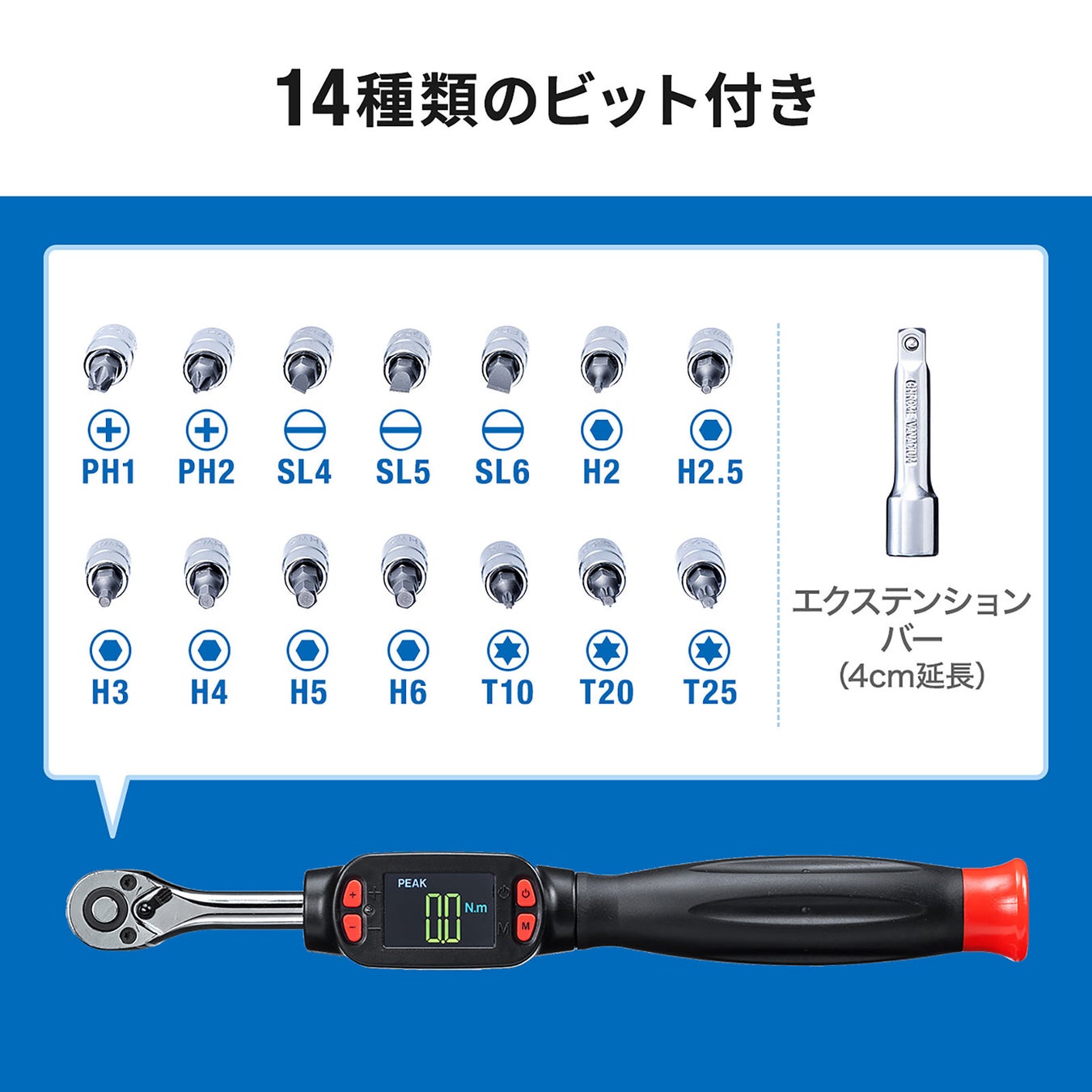 デジタルトルクレンチ 差込角6.35mm・1/4インチ 1~30N-m ビット14個 液晶付き