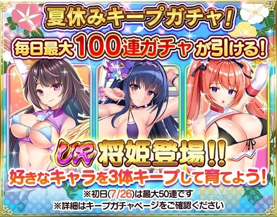 合同会社EXNOA(本社:東京都港区、CEO:村中 悠介、URL: https://games.dmm.com/)は、戦国乱世で410名以上の可愛い将姫(しょうき)達と契りを繰り広げながら天下統一を目指している龍人様が全国で230万人を超えた全年齢向け萌える戦国ゲーム『戦乱プリンセス』(以下、"戦プリ"(せんぷり))のスマートフォンおよびPCゲームサービス(https://games.dmm.com/detail/senran/)にて、7/26(火)より『夏休み無料育成ガチャ』を開催したことをお知らせいたします。