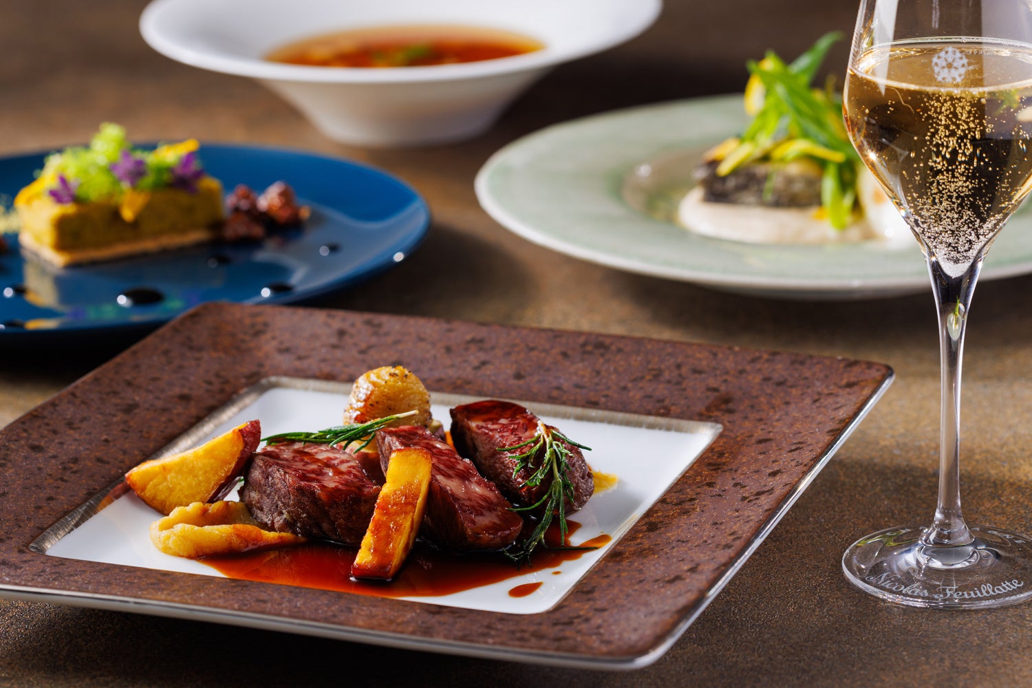 レストランシェフ 西間木貴大が手掛ける洋食コースは、メインに濃厚な赤身と上品な脂のバランスに優れた群馬県産の黒毛和種「赤城和牛」を使用いたします。10月は赤城和牛に風味豊かな鰹出汁を合わせることで肉の旨みを感じながらもさっぱりと食べられる仕上がりに、11月は赤城和牛をじっくりとローストし、秋の味覚サツマイモとともに旨みあふれるジュ(ソース)で堪能できる一品となっており、月ごとに異なる味わいをお楽しみいただけます。