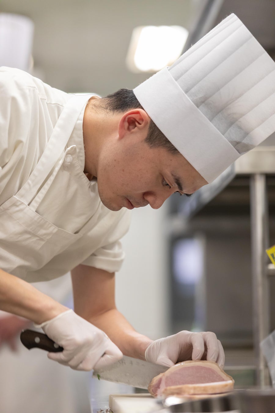 次世代を担う調理スタッフのスキルとマインドの向上、成長機会の創出を主な目的とした「東急ホテルズ料理コンテスト」は、毎年課題を設け、実施しております。本年度の課題は、「ローストポーク」をテーマ食材とし、それを活かしたガルニチュールとソース、調理法を考案し、全国のホテルでの販売を前提としたメインディッシュを開発すること。審査項目は、味・ポークの活かし方・商品力・見た目・料理のテーマ性・料理の完成度で、決勝大会では厨房で選手が調理から片付けまでを行う様子が審査会場に中継され、実食審査を終えた後、選手は審査員に対してそれぞれの作品のアピールを行いました。