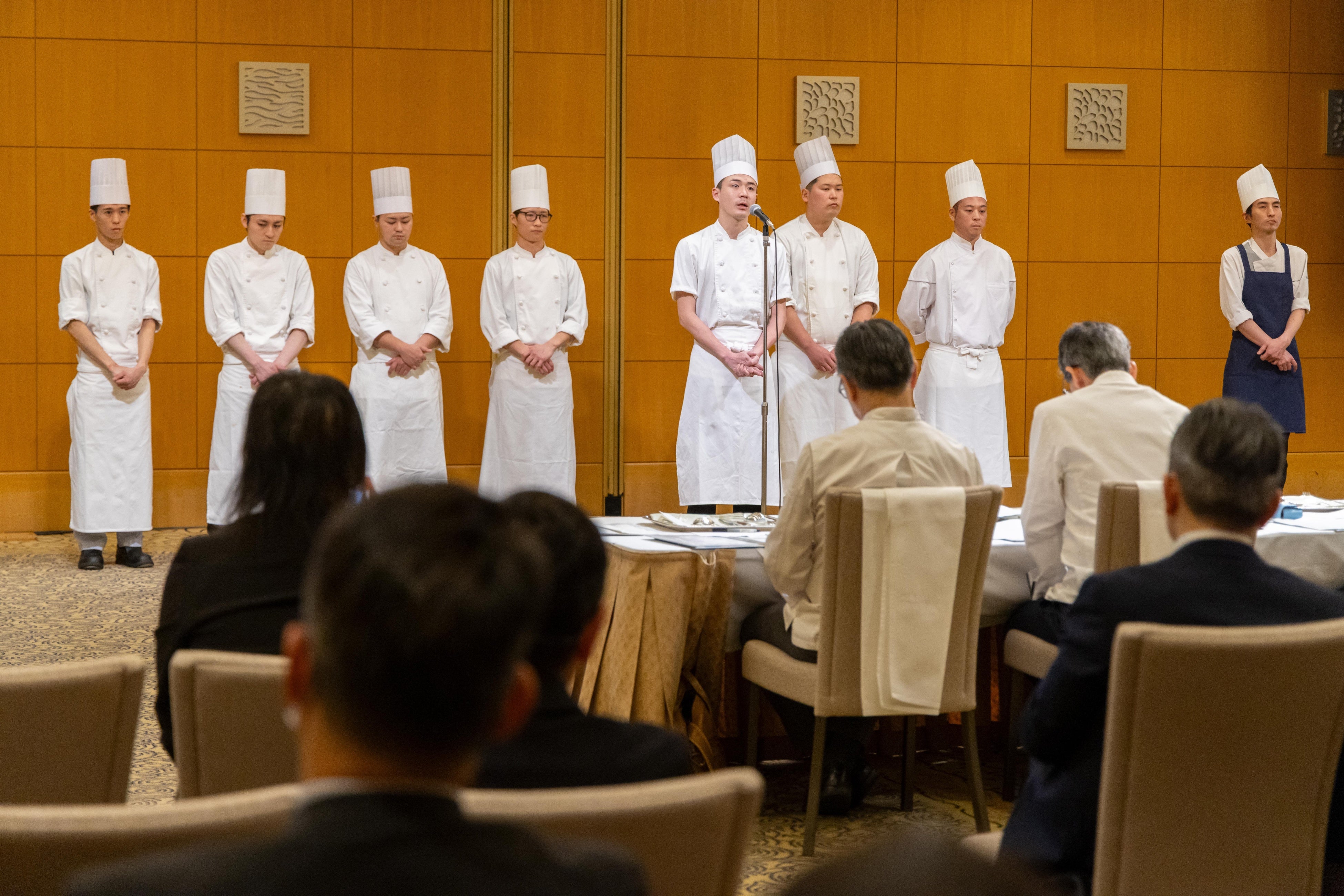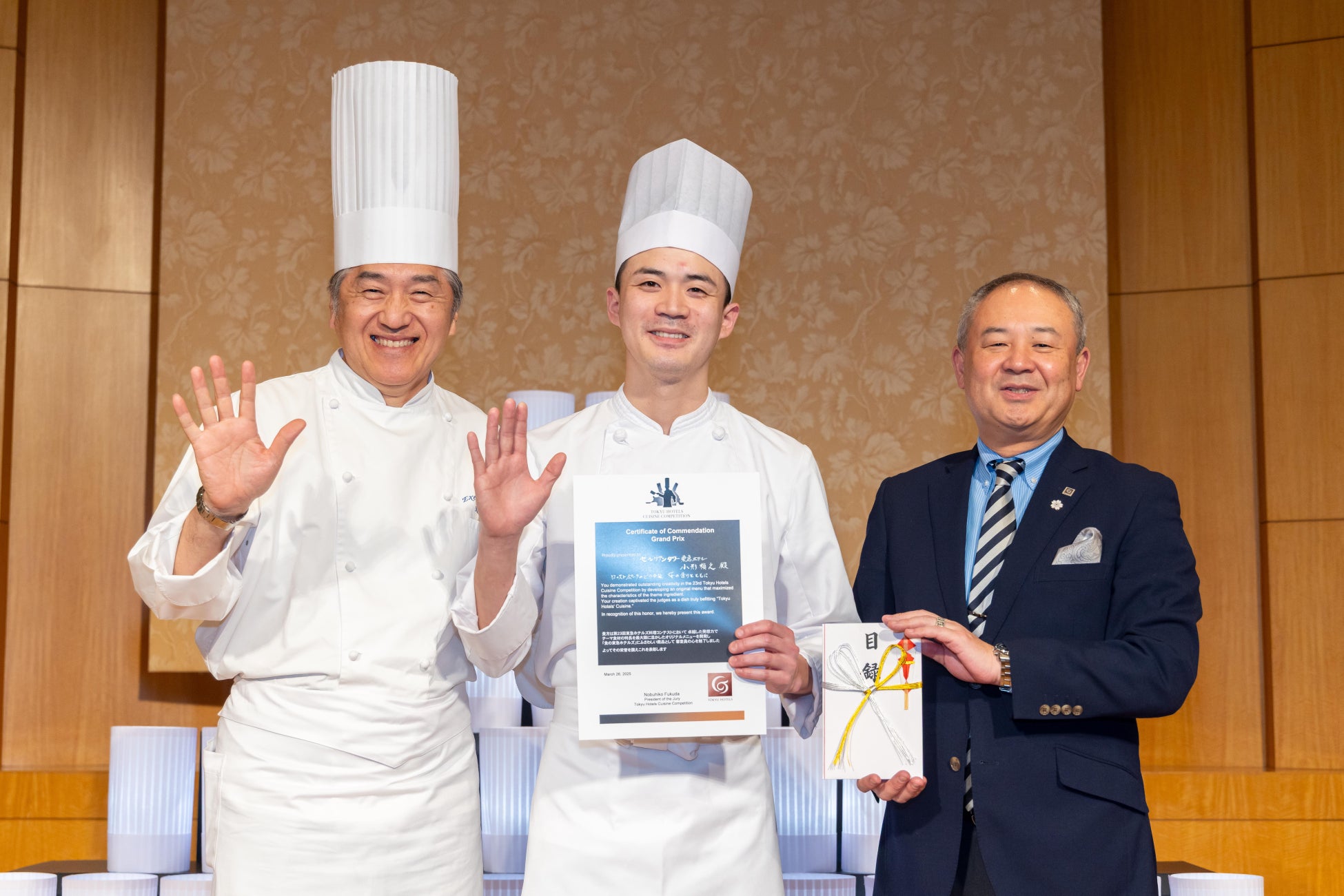 厳正な審査の結果、グランプリはセルリアンタワー東急ホテル 小形禎之、準グランプリは京都東急ホテル 水本雄介、審査員特別賞は大阪エクセルホテル東急 青山太に決定。それぞれに表彰状と、副賞として料理研修とレストラン視察のための支援金、そしてファイナリスト全員に、これからの業務に使えるよう名前を刻印したペティナイフを授与しました。表彰式で、グランプリを受賞したセルリアンタワー東急ホテルの小形は、大会に集中できる環境を整えてくれたチームへの感謝の想いをまず述べ、そして作品に対しては「召し上がっていただくゲストのことを一番に考え、大切な家族に提供する気持ちで調理をした」と語りました。