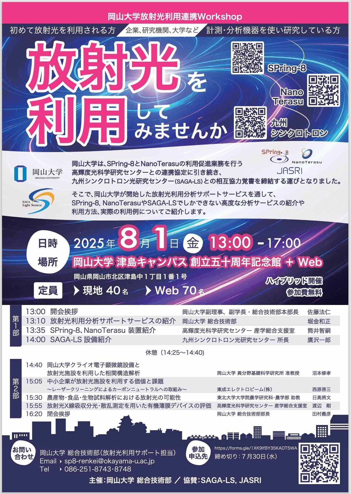 国立大学法人岡山大学(本部:岡山市北区、学長:那須保友)は2025年8月1日、本学総合技術部主催の「放射光利用連携Workshop~放射光を利用してみませんか~」を本学津島キャンパスの創立五十周年記念館での現地開催とオンラインでのハイブリッド形式で開催しました。本学の研究者以外に全国から大学・研究機関や企業などから106人が参加しました。