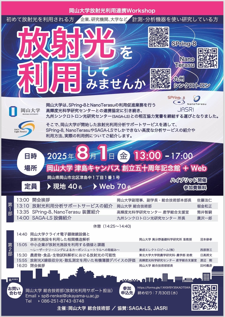 【岡山大学】「放射光利用連携Workshop」を開催~放射光を核とした産学官連携による研究力・イノベーション創出強化へ~