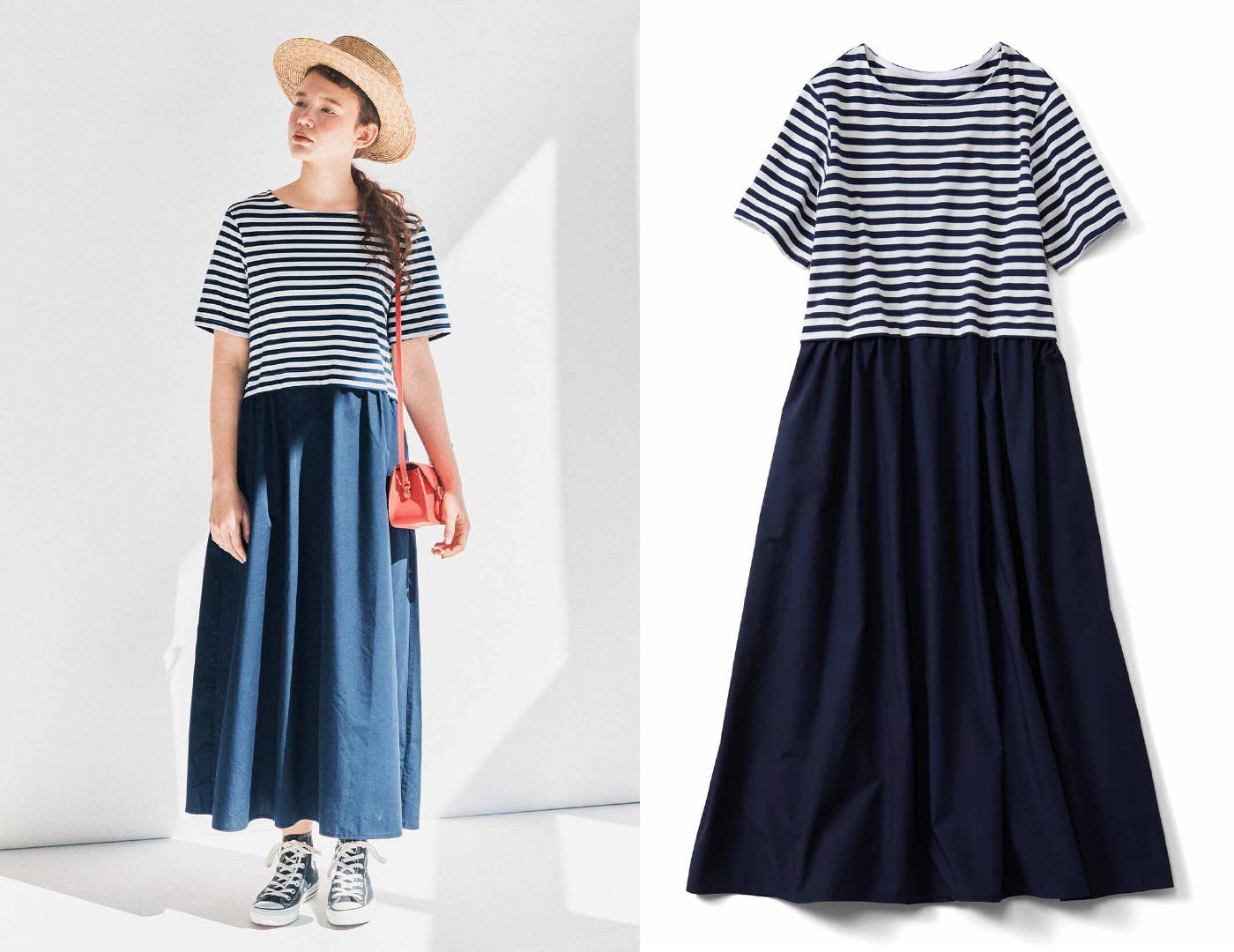 ベーシックなスカートにボーダーのトップスを重ねているようにドッキングしたワンピースです。スカート部分はしわになりにくい素材で、お手入れも楽ちんです。ゆったりとしたシルエットが、おなかまわりや二の腕を自然にカバーします。