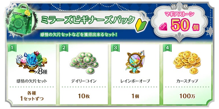 無償を含むマギアストーンで購入できる「ミラーズビギナーズパック」には以下のアイテムが封入されています。