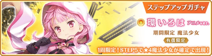 ・『期間限定 環いろは アニメver. ピックアップガチャ』『有償限定 ステップアップガチャ 環いろは アニメver.編』の★4魔法少女1体確定までのカウントは共通ではなく、引き継がれません。