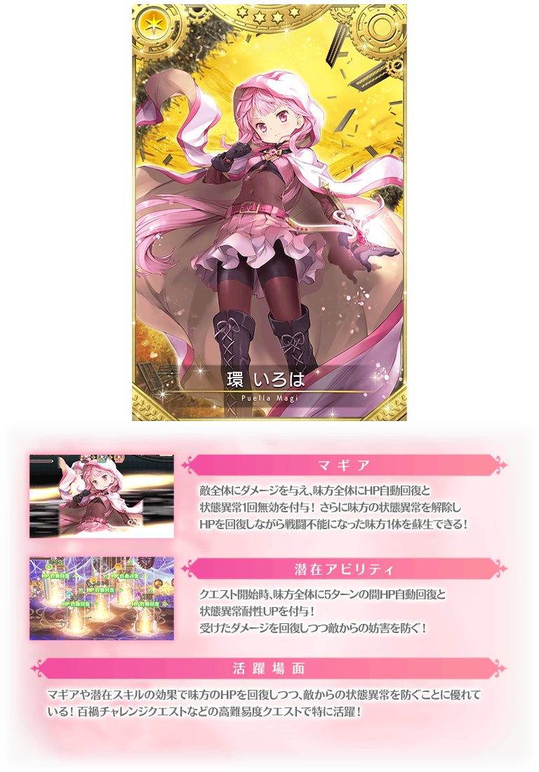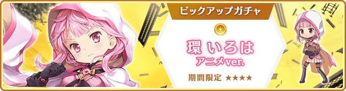 『有償限定 ステップアップガチャ 環いろは アニメver.編』では下記ピックアップ対象の魔法少女およびメモリアの提供割合がアップしております。
