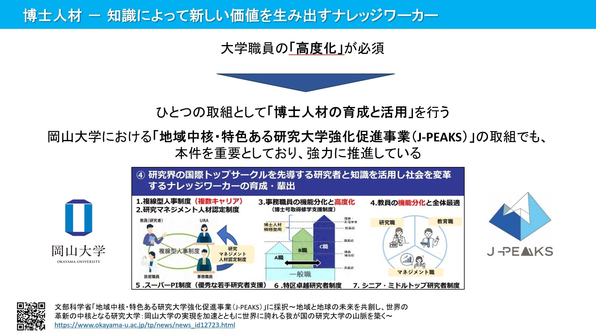 ・【岡山大学】岡山大学「大学院修学支援制度」を始動 ~大学職員の高度化のひとつの手段としてナレッジワーカーとしての博士人材を育成・活用し、かつ大学法人経営や大学院改革の強化へ~