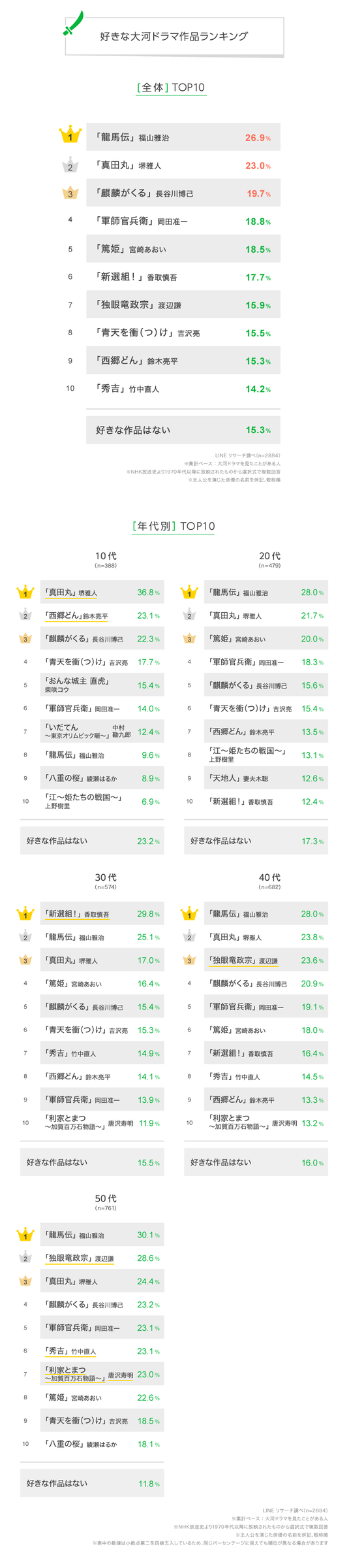 全体TOPは「龍馬伝」(主演:福山雅治)という結果に。すべての年代でもランクインし、20代・40代・50代でもTOPとなっています。特に50代男性に人気があり、3割超と高い割合です。
