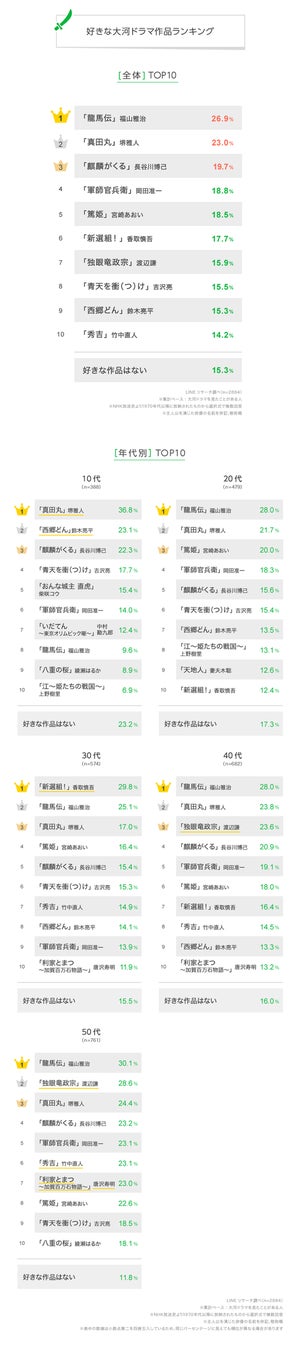 【LINEリサーチ】大河ドラマを「見たことがある」人は男女ともに6割弱、好きな大河ドラマ作品は全体で「龍馬伝」が1位にランクイン