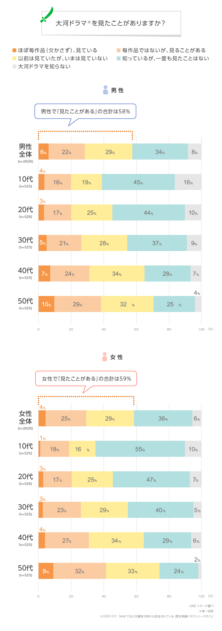全体では6割弱が大河ドラマを「見たことがある」(※)と回答。男女別の割合をみると、男性が58%、女性が59%でほぼ同率という結果に。