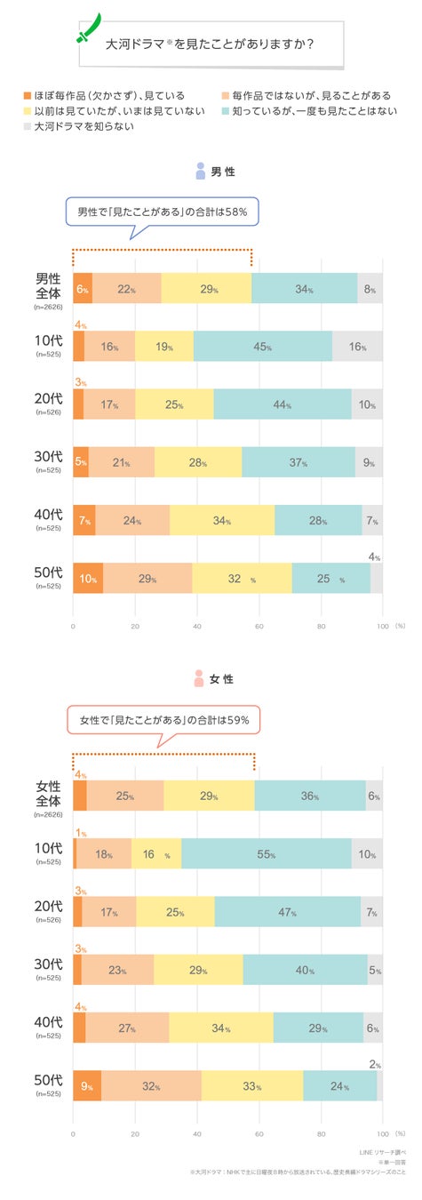 このたびLINEリサーチでは、日本全国の男女を対象に、大河ドラマを見たことがある人の割合や好きな大河ドラマの作品について調査しましたので、その結果をお知らせいたします。