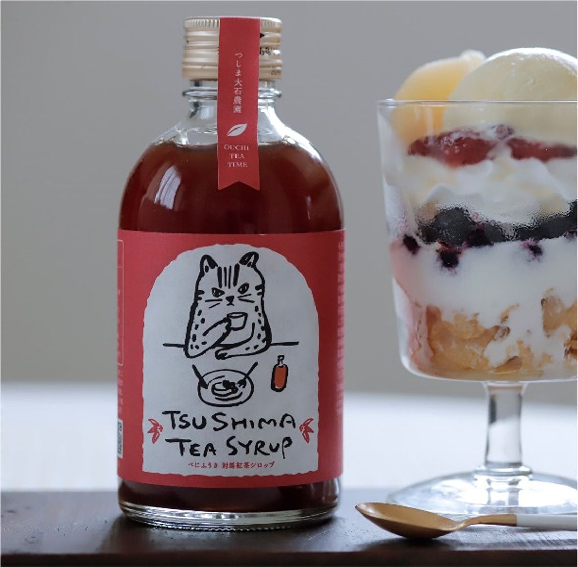 対馬で栽培する「べにふうき」をつかった国産紅茶のシロップです。ミルクで割ったり、アイスにかけたりと幅広い用途でご利用いただけます。ツシマヤマネコをデザインした落ち着いたボトルは、猫好きな方に人気です。