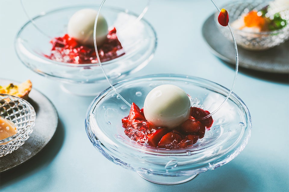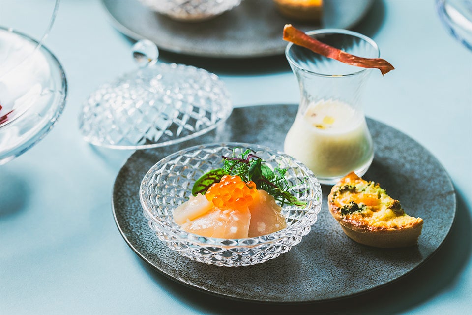 更にお1名さま1皿ずつ、北海道産のホタテのマリネと一口サイズのキッシュ、冷たいじゃが芋のスープを乗せたセイボリープレートと、スペシャルプレートとして、巨大な真珠をイメージしたレアチーズムースをご用意します。イチゴの上に乗せた軽い口溶けのムースの中にはマンゴーパッションソースが入っており、フルーティーな風味とレアチーズのまろやかさが絶妙に絡み合います。ラグジュアリーティーブランドの「TWG Tea」ほか、お好きなドリンクと共にここでしかあじわえない特別メニューを存分にお楽しみください。