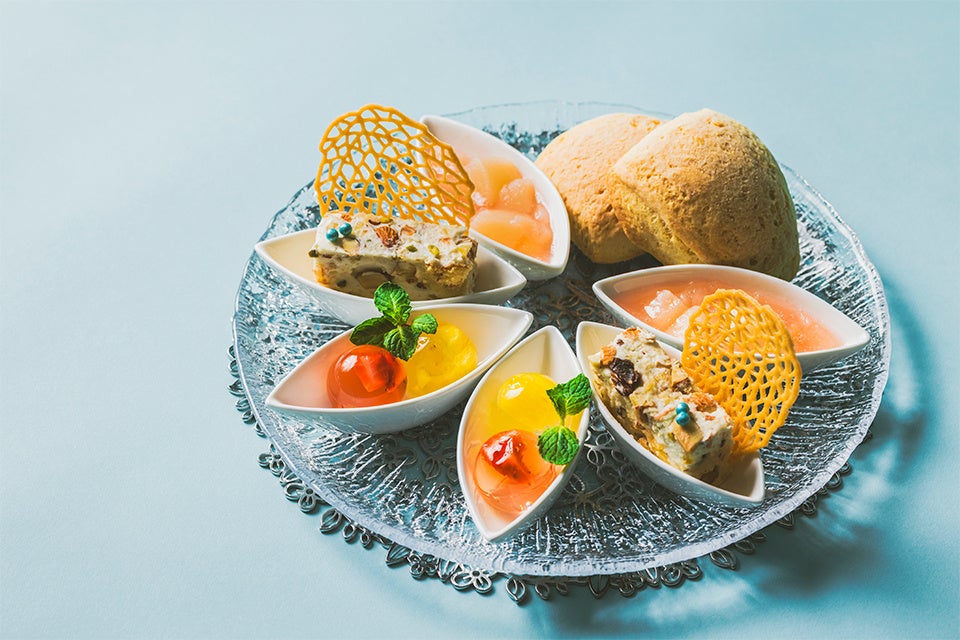 上段の主役は真珠貝を模した「貝殻チョコと白いコーヒームース」。雫のような丸みを帯びたフォルムと淡い乳白色の真珠は、コーヒーの香りを牛乳に移して仕上げた滑らかな口当たりのムースです。SNSで「食べる宝石」として人気の琥珀糖も注目のアイテム。表面のシャリシャリ感と、寒天の柔らかい2つの食感を楽しめます。下段には、華やかな「エルダーフラワーのゼリー」や、はちみつの甘味とナッツの香ばしい風味で濃厚な味わいの「ヌガー風ムースケーキ」、ティーフーズには欠かせないスコーンなどがお皿いっぱいに並びます。