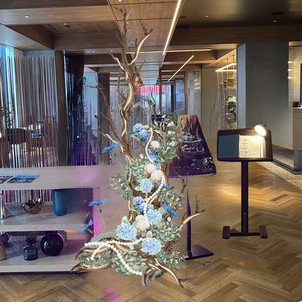 期間中はレストラン入口に流木と青い花、パールをあしらったフォトスポットを設置します。アフタヌーンティーと一緒にシェアしたくなる写真を撮り、思い出や話題作りにご活用ください。