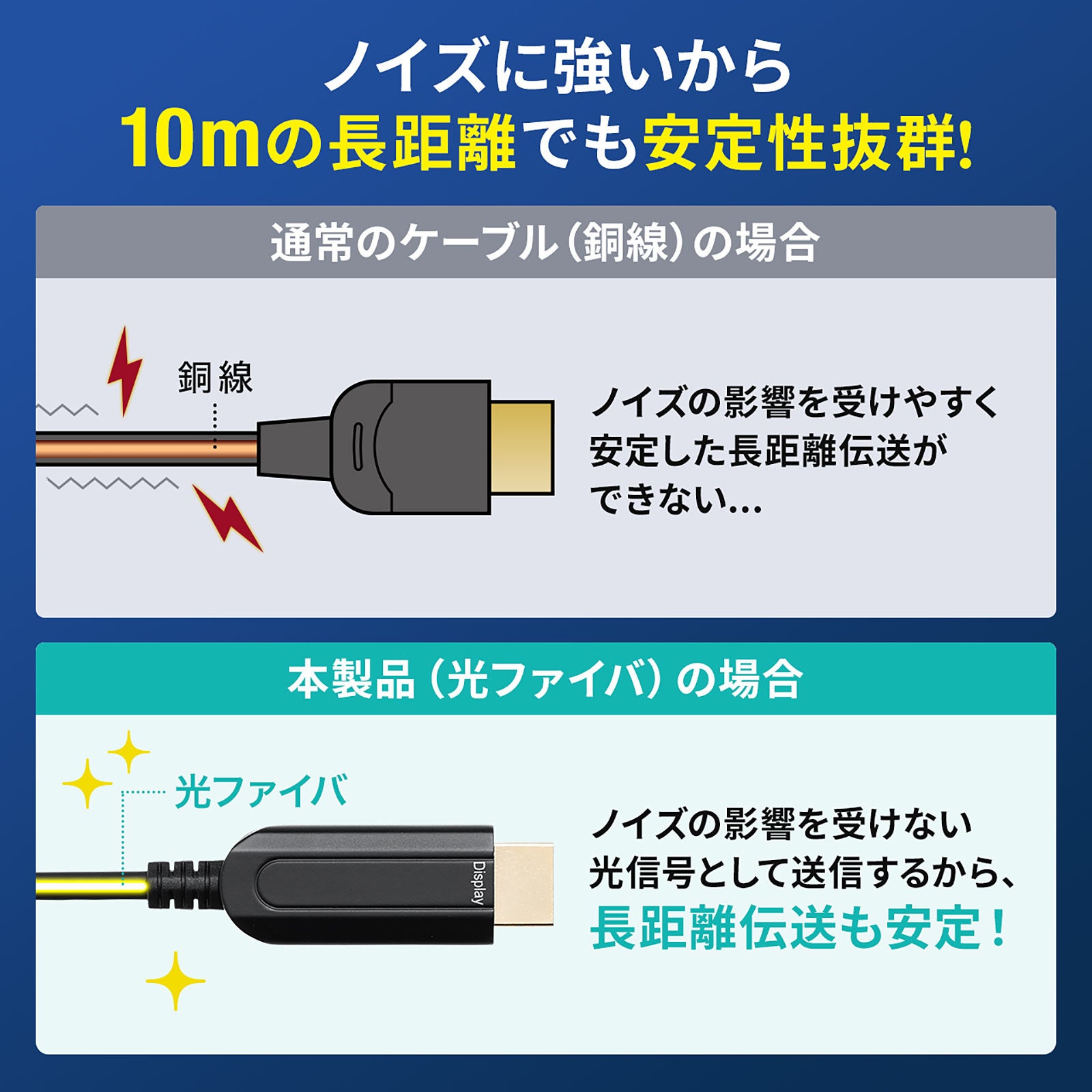 サンワサプライ株式会社(本社:岡山市北区田町1-10-1、 代表取締役社長 山田 和範)が運営している直販サイト『サンワダイレクト』では、ノイズに強い光ファイバーケーブルで、10mの長距離でも高画質、4K/60Hzに対応したDisplayPortをHDMIに変換する長尺ケーブル「500-KC039-10」を発売しました。