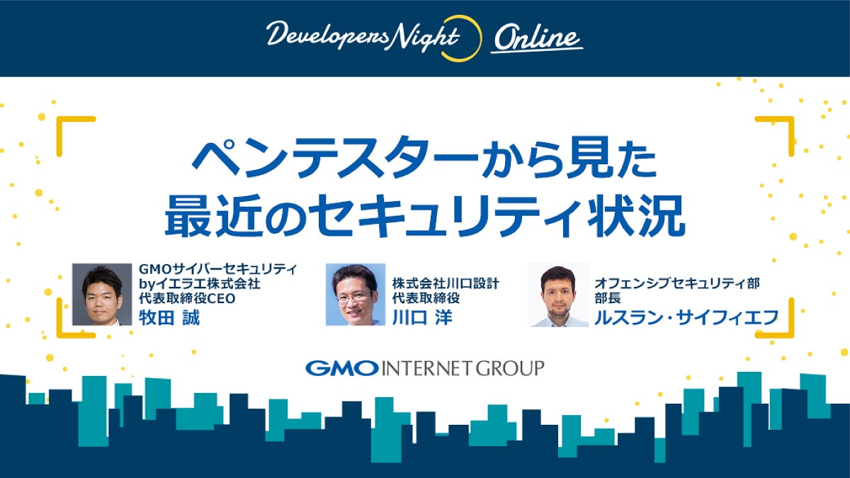 GMOインターネットグループは、2022年4月21日(木)にエンジニア向けテックイベント「Developers Night #34」として、「ペンテスターから見た最近のセキュリティ状況」を開催いたします。本イベントには、GMOサイバーセキュリティ byイエラエ株式会社(代表取締役CEO:牧田 誠 以下、GMOサイバーセキュリティ byイエラエ)において最前線で活躍するホワイトハッカーが登壇し、ペンテスター(※)目線で昨今のサイバーセキュリティ情勢や開発・運用時におけるサイバーセキュリティの留意点・課題等について語り合います。