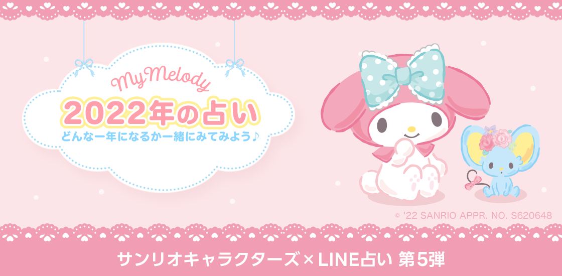 マイメロディの誕生日(1月18日)である、本日より提供開始となった「マイメロディの占い~2022年のあなたの全運勢~」では、2022年の運勢について恋愛運からあなたへ贈るメッセージまで、マイメロディと一緒に6つのカテゴリーの占いをお楽しみいただけます。同占いは、LINE占いアプリをダウンロードして生年月日を登録するだけで体験いただけます。