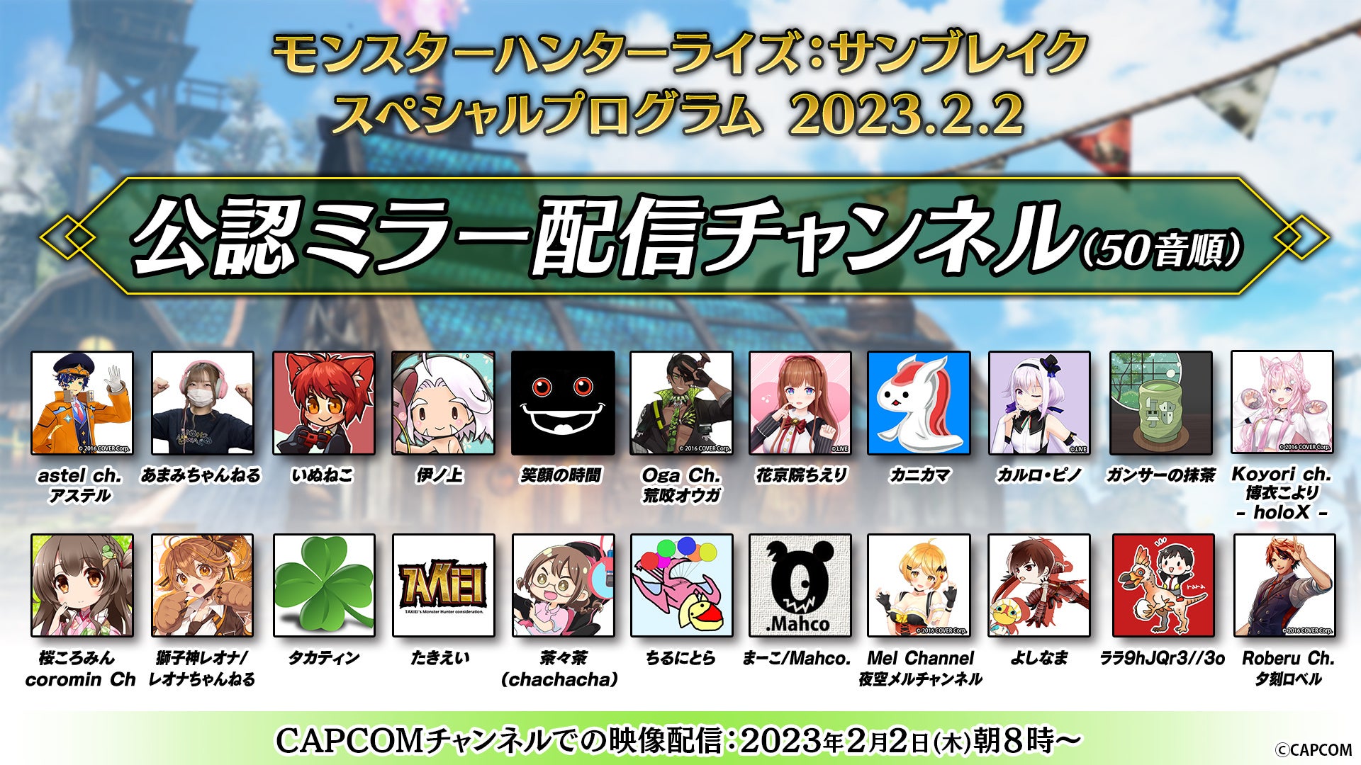 - 【特別企画】「モンスターハンターライズ:サンブレイク スペシャルプログラム 2023.2.2」公認ミラー配信 YouTubeチャンネル(50音順・敬称略)