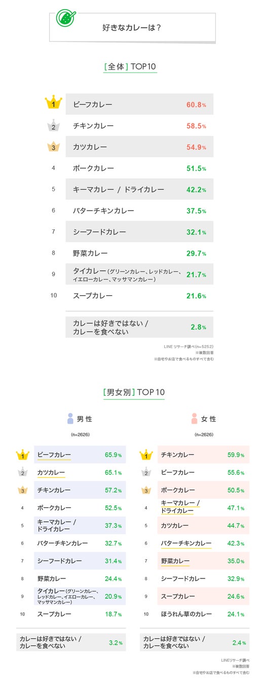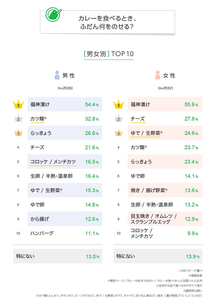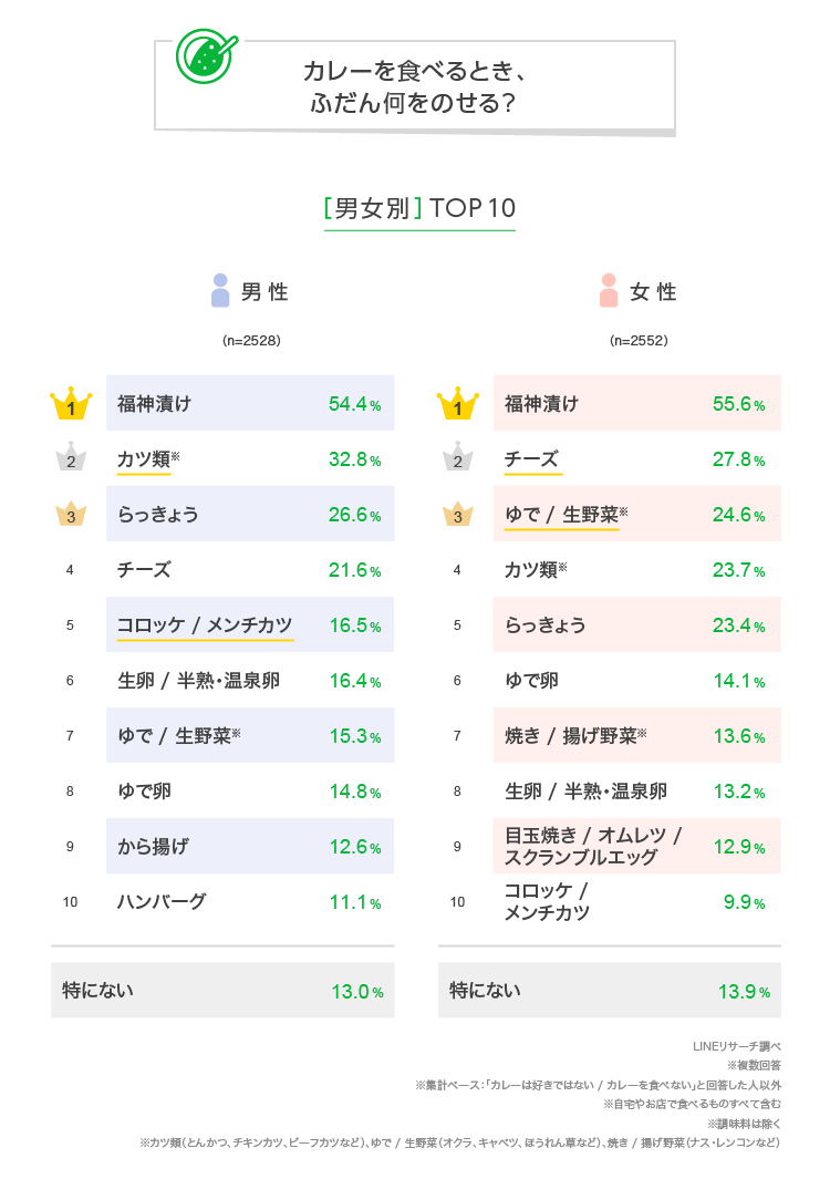 【LINEリサーチ】好きなカレーは「ビーフカレー」が1位 人気のトッピングは男女ともに「福神漬け」が1位にランクイン、2位以降は男女で異なる結果に