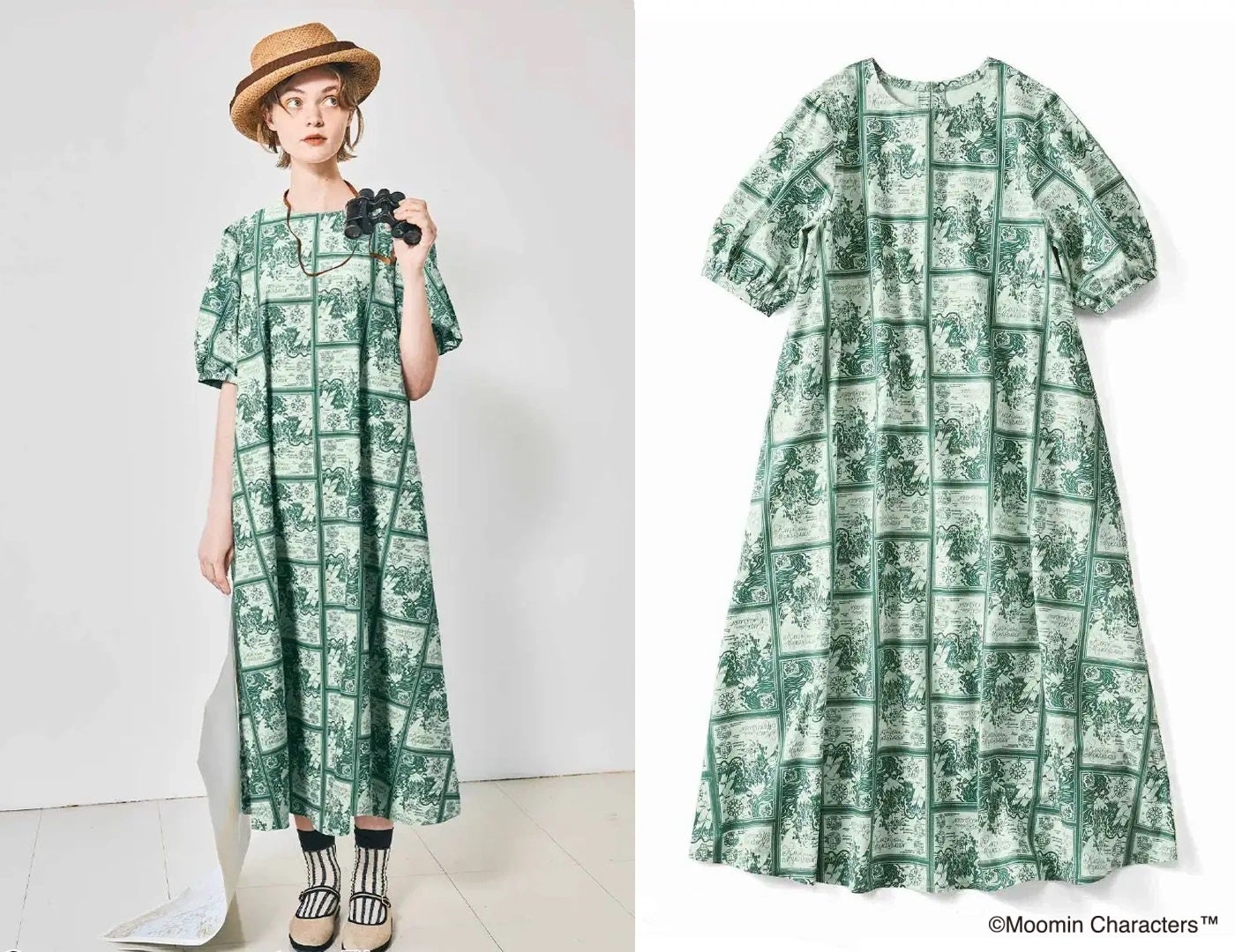 ギャザーを入れたぽんわり袖が特徴のワンピースです。ゆったりとしたシルエットで、着心地が軽やかです。小説『ムーミン谷の彗星』冒頭のムーミン谷の地図の挿し絵がプリントされています。シックなカラーで、大人っぽく着こなせます。