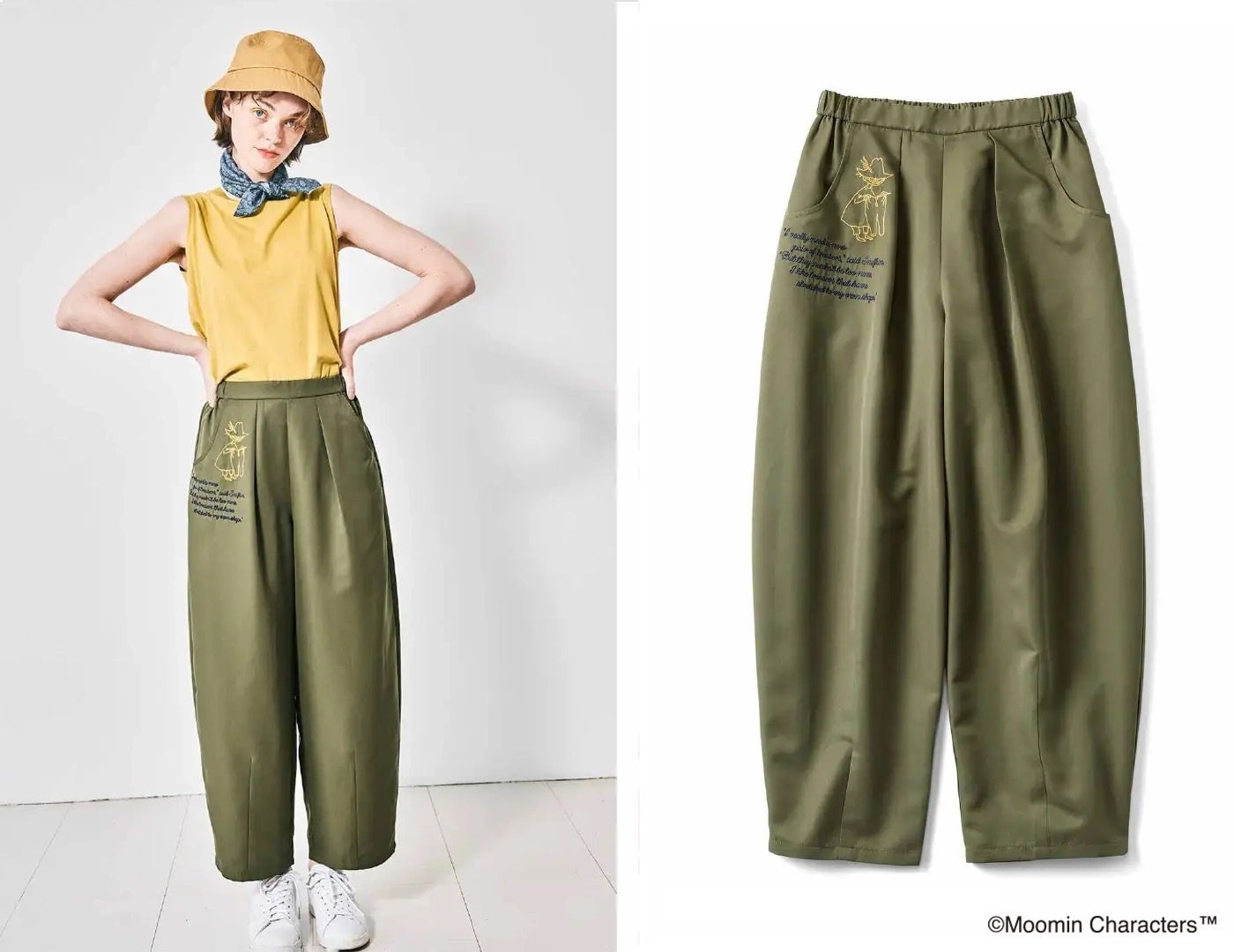 スナフキンをイメージしたカーキ色のパンツです。『ムーミン谷の彗星』の1シーンを刺しゅうされています。スナフキンのように気軽に出かけられるように、ポケットは4つ配置しています。やわらかな素材とトレンド感のあるカーブシルエットが特徴です。