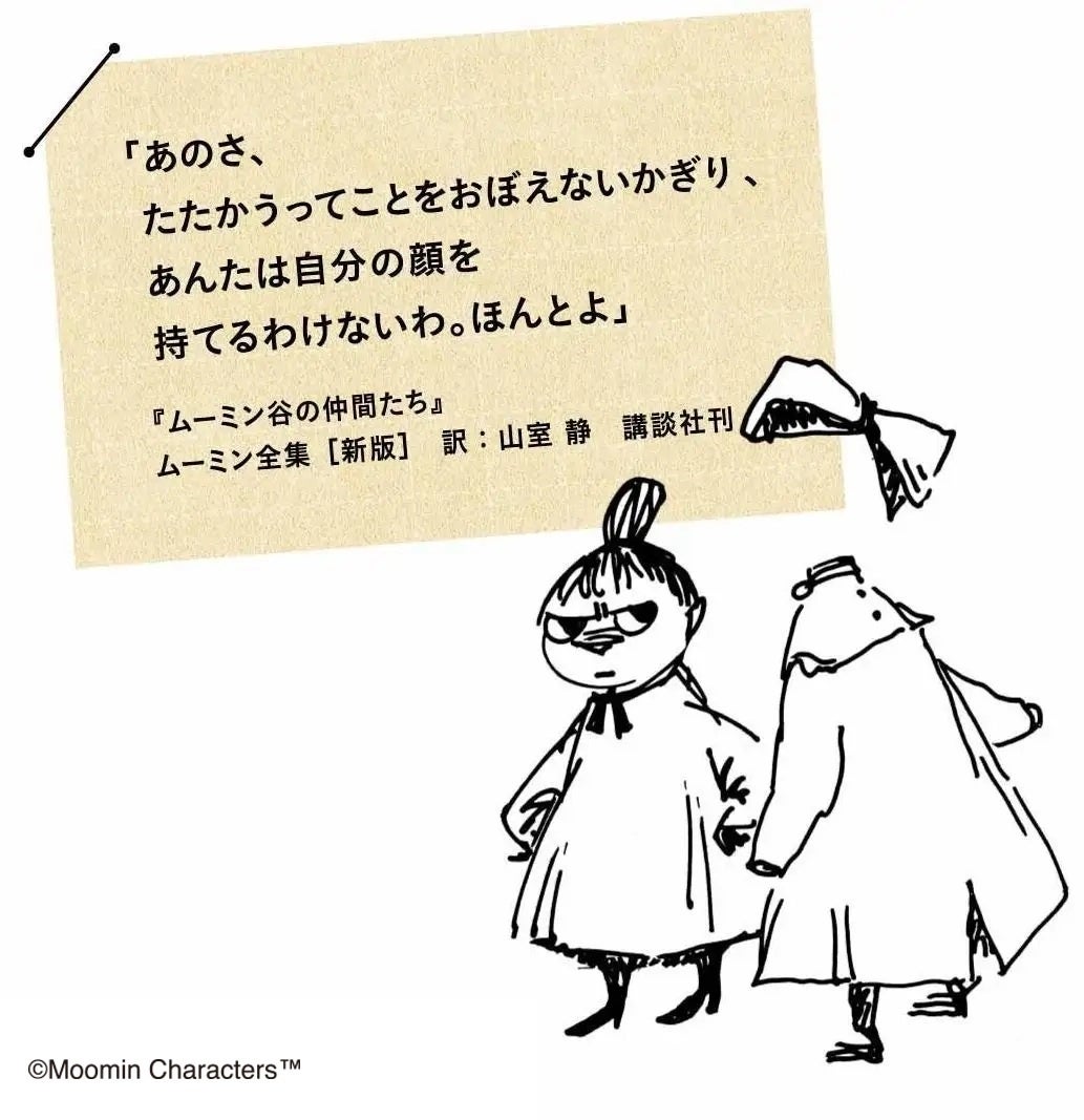 ラフなサイズ感がかわいく、ゆったり着られるTシャツです。胸には小説『ムーミン谷の仲間たち』の一説とその挿し絵がプリントされています。リトルミイがニンニに語った深い言葉と、トーベ ヤンソンの手描き文字を基にしたフォント「tove script」の書体にも注目です。