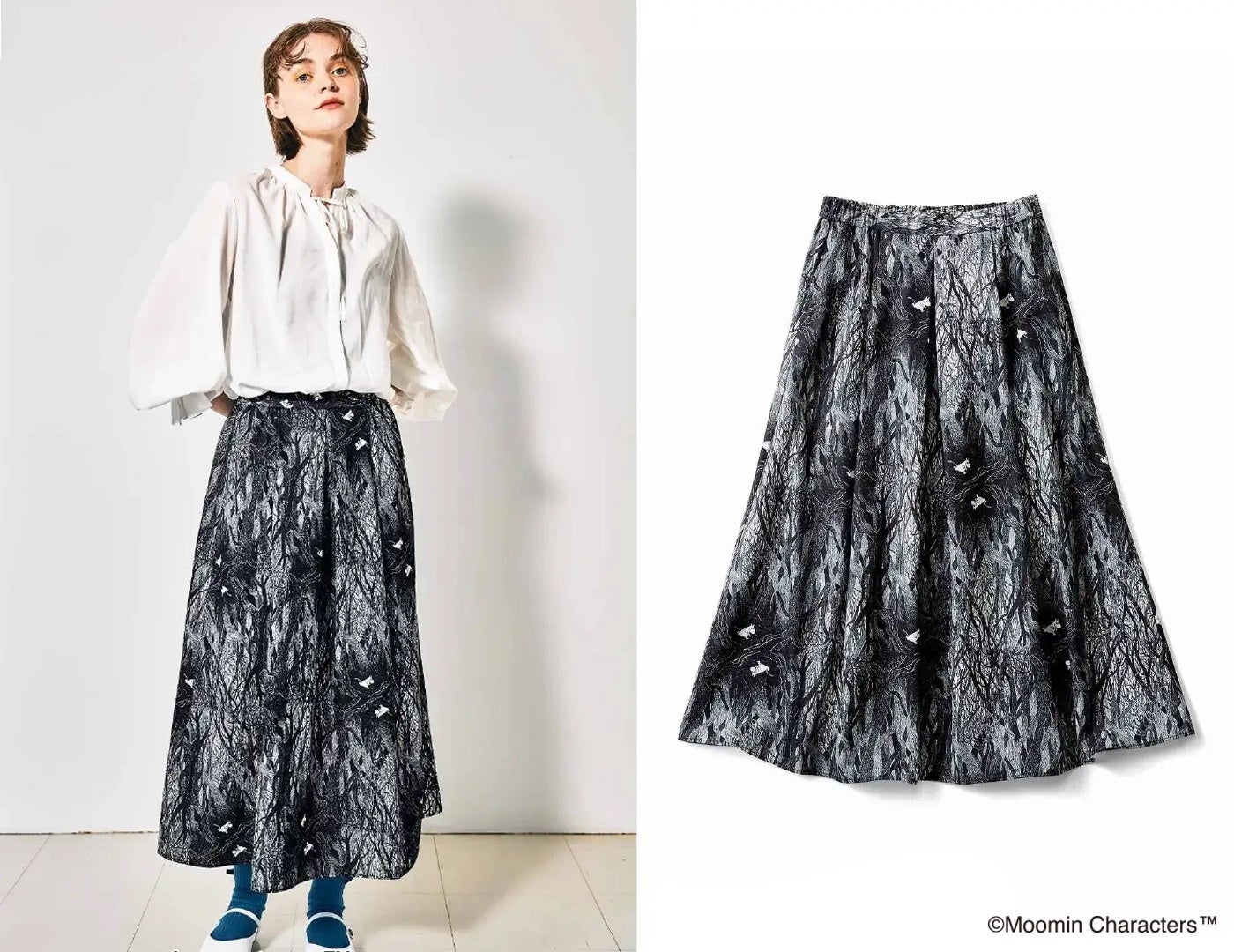 森を走るムーミンがスニフを探す挿し絵をプリントしたスカートです。ふんわり広がるシルエットをモノトーンでシックに。タックを寄せた立体的なフォルムが特徴で、ウエストは後ろゴムなのでトップスをインしてもきれいに決まります。